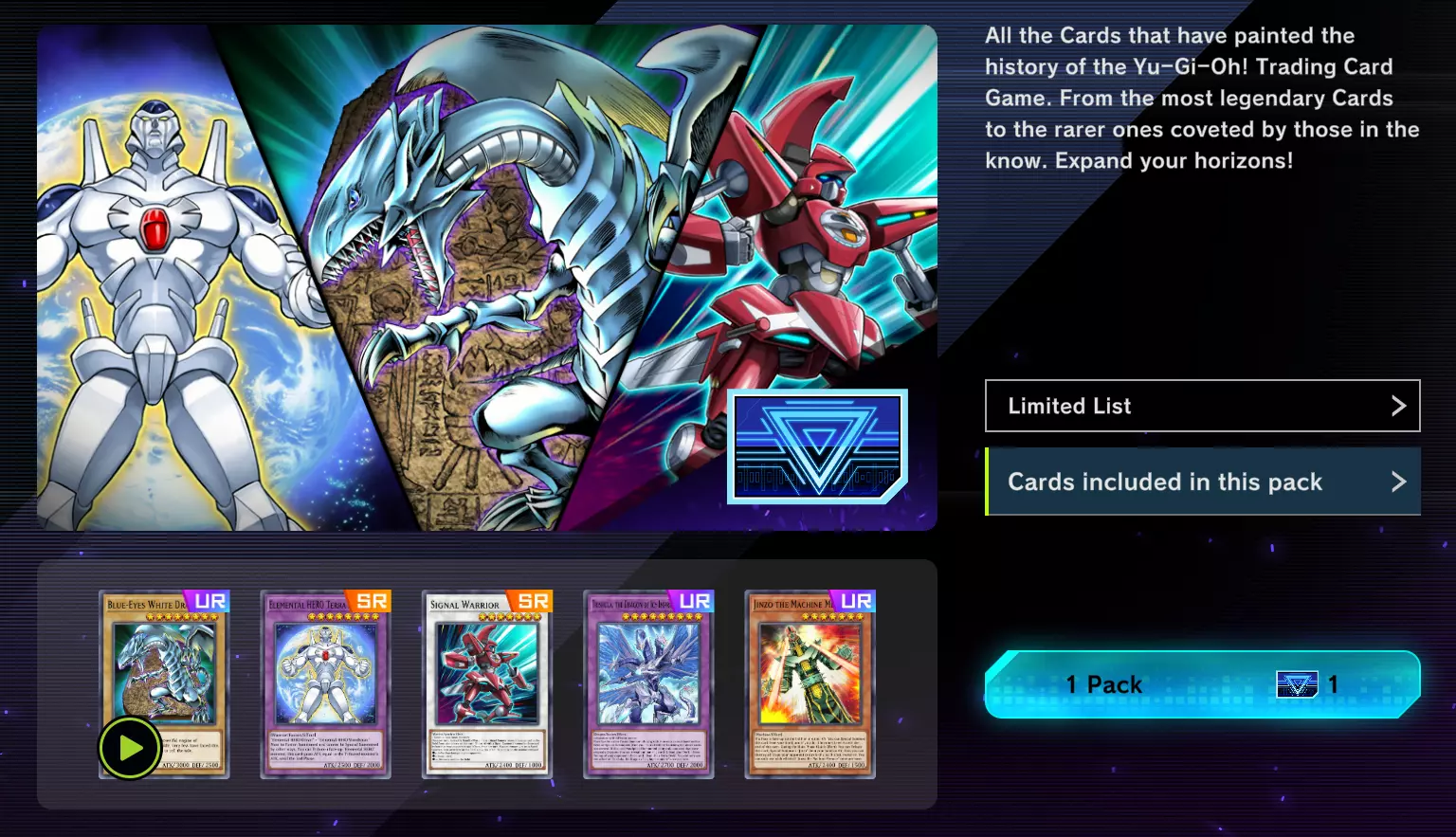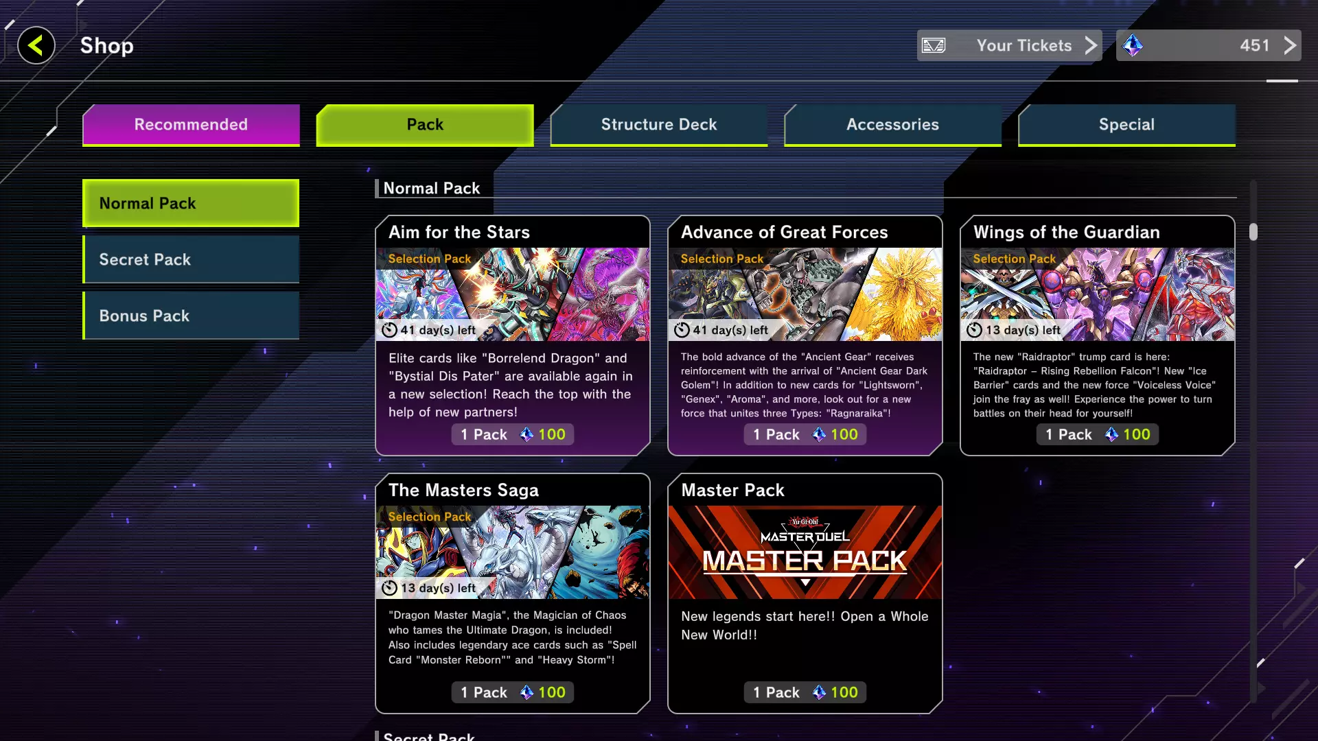 它们包含不同原型的卡牌,并且针对特定主题,例如用于融合的卡牌、经典动漫卡牌、强大的怪物等等。卡牌列表会定期更换,但核心玩法保持不变:进入商店,消耗宝石,购买补充包。秘密补充包(Secret Pack)是无法直接在商店中购买的补充包。