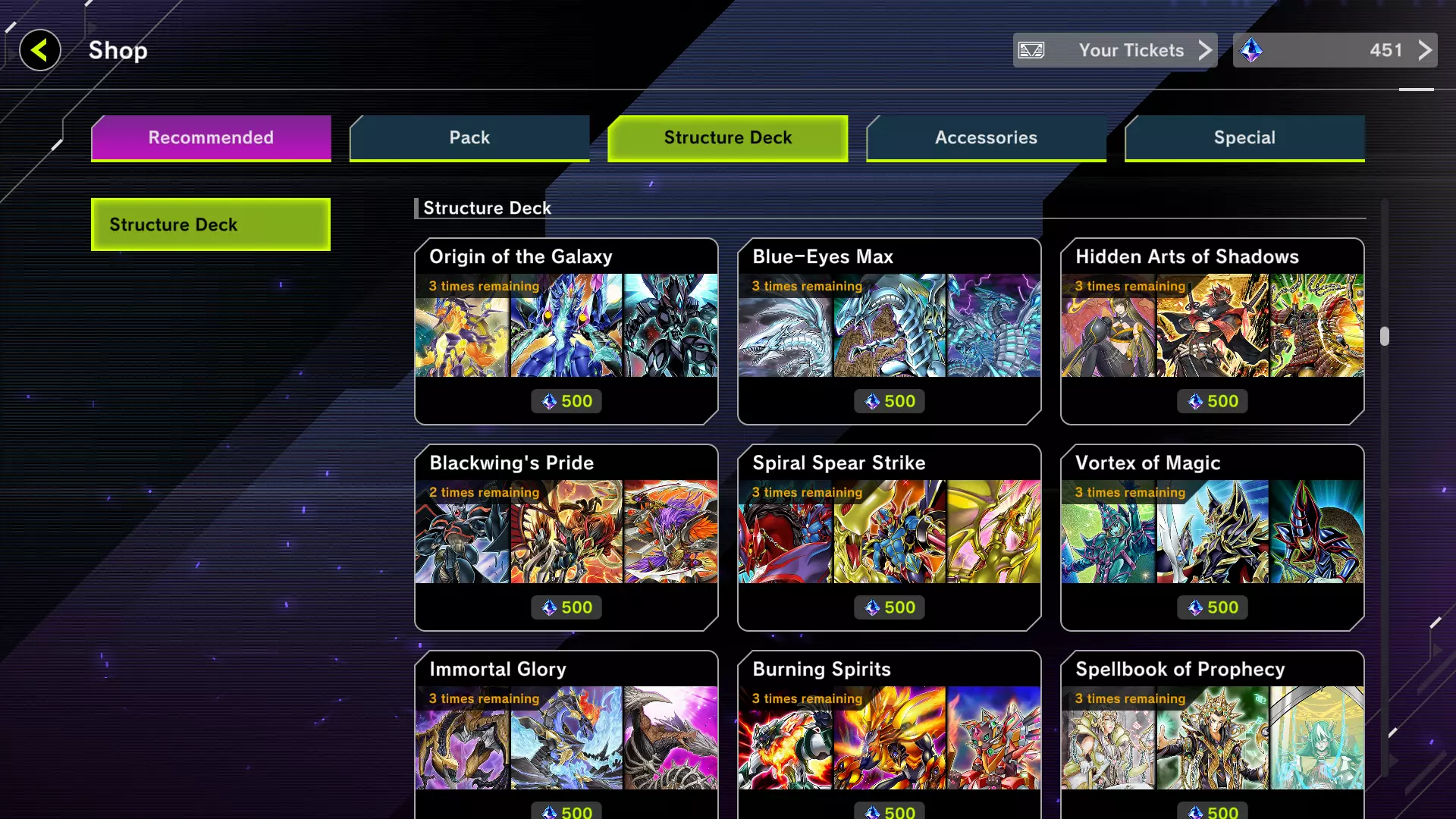 这些通常是最弱、最垃圾的卡牌,甚至无法分解成资源。这类补充包需要用决斗奖励中经常掉落的票券购买。在主流卡组中抽到这些卡牌的概率几乎为零,所以直接忘记游戏中存在这些补充包吧。制作卡牌的资源可以通过分解不需要的卡牌、完成任务和决斗的奖励以及决斗通行证(我强烈推荐购买黄金版)来获取。此外,完成游戏的单人模式可以获得10000宝石、100 SR粉尘和100 UR粉尘。 初始卡组 游戏开始时,你只有一套起始卡组,这套卡组毫无用处。开始刷取宝石和资源的最佳选择是在商店购买预组卡组。