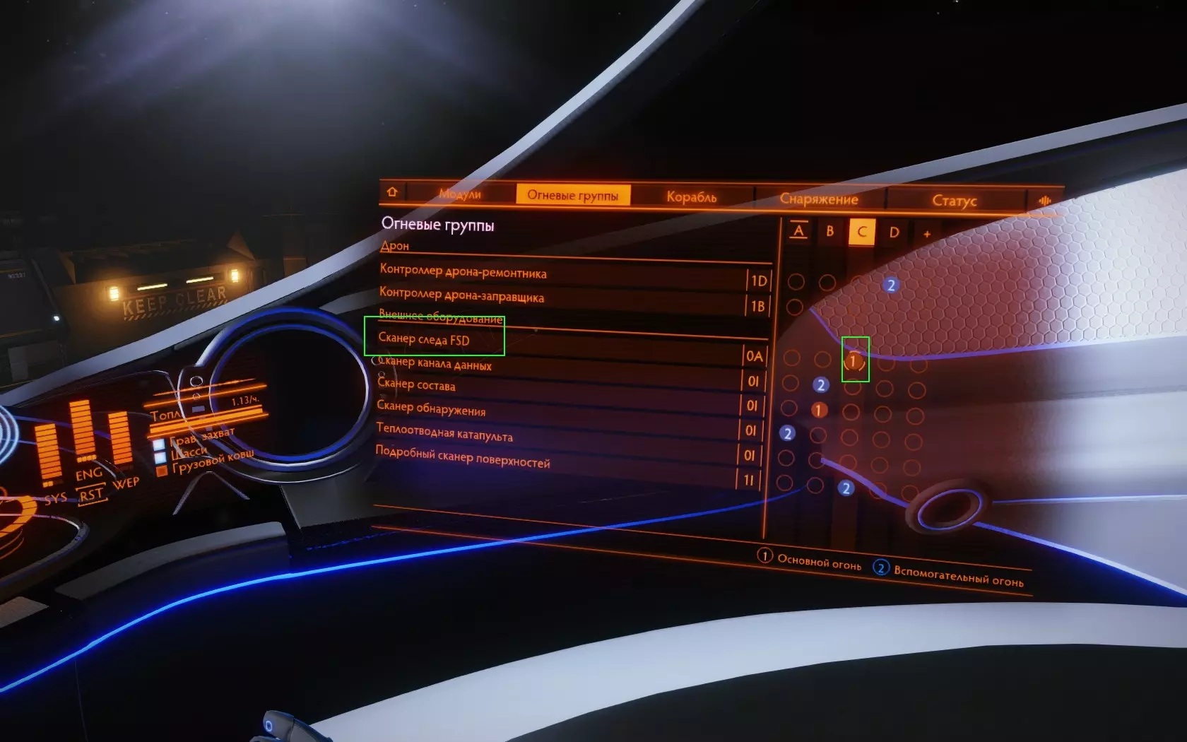 在同一个工坊菜单中找到FSD(框架转移驱动),其中包含射程提升功能。用鼠标(或其他操作方式)点击它,然后按下底部激活的“固定蓝图”按钮。(权限等级较低时,你只能固定当前权限等级可访问的最高升级等级的蓝图。)当你的访问等级提升时,需要飞回基地找老妇人更新图纸,以便查看当前你能使用的所有模块。每个工程师只能固定一张模块图纸。