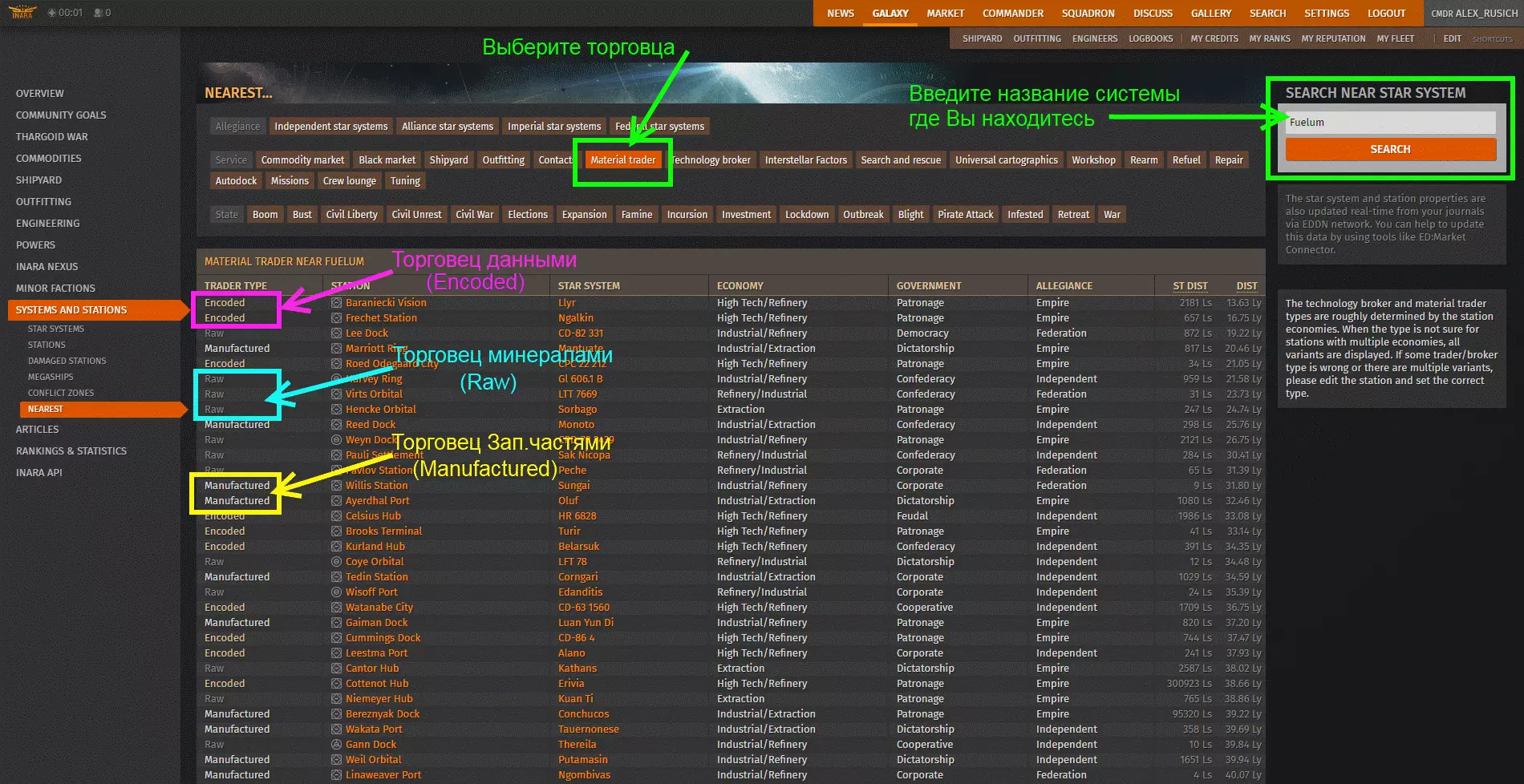 不建议…… 别嫌麻烦,回去找奶奶让她帮你摆弄模块吧。她虽然年纪大了,但经验更丰富,所以奶奶亲手弄出来的效果肯定比你瞎鼓捣强。 3. 升级 再检查一遍——你船上装的模块是不是你需要的尺寸(数字)和等级(字母)。如果都对,那就一边在心里暗骂开发者设计得让人头大,一边继续升级吧。除了对超光速引擎本身进行升级外,飞船重量也会影响跳跃距离,而飞船重量由各模块的重量总和构成。因此,你需要尽可能降低模块的重量。这也可以通过使用尺寸更小的D级模块来实现(D级是最轻的模块)。例如,在规格为8的主设备插槽中,可以安装规格为5的模块。另外,尽量在辅助装备中使用同属D级且尺寸较小的轻型模块。例外情况包括无重量模块(如自动修复单元、燃油 scoop)以及框架转移驱动本身——框架转移驱动需要最大尺寸和A级,这是最佳选择。 但关于模块及其尺寸和等级的选择,应该在你决定找工程师升级之前就确定好。 每个模块只能通过一种类型的升级进行强化。无法在提升FSD的射程后再对其进行其他升级。后续升级会清除该模块之前所有的升级内容。特定模块的每个升级阶段的实验效果也是如此。请在模块完全升级到最大等级之前耐心选择实验效果,并仅在最终升级等级时应用该效果。起初,你只能通过第一个螺栓来升级任意模块。这是因为你在奶奶那里的声望太低了。(这个老吝啬鬼,连“金属融合物”都嫌少!) 提升在这位老妇人那里的声望需要通过消耗资源进行升级。 从“框架转移驱动”开始升级。一旦你遇到无法使用的螺栓或缺少的资源,就换另一个模块继续。要提升在恶毒老妪处的声望,升级她能拆解的所有设备会有所帮助。例如,可以将传感器升级为【轻量化传感器】,以此来降低其重量。对于引擎,将机动升级到【纯粹调校】很有用。 如果使用较小尺寸的反应堆,建议升级动力装置以提高功率(装甲会增加重量,我们不需要)。 只有将所有模块完全升级(每个螺母的升级都必须完成,螺母图标会变为带有对勾的图标),才能进行实验效果的操作。对于FSD,重力分配器很有用;对于动力装置和引擎,精简版很有用。 某个补丁修复后,现在可以在第一个螺栓上安装实验效果,不会产生影响。 4. 与商人交换资源 若要寻找能将您多余组件换成所需组件的商人,可使用Inara门户。使用方法已在图片中展示。