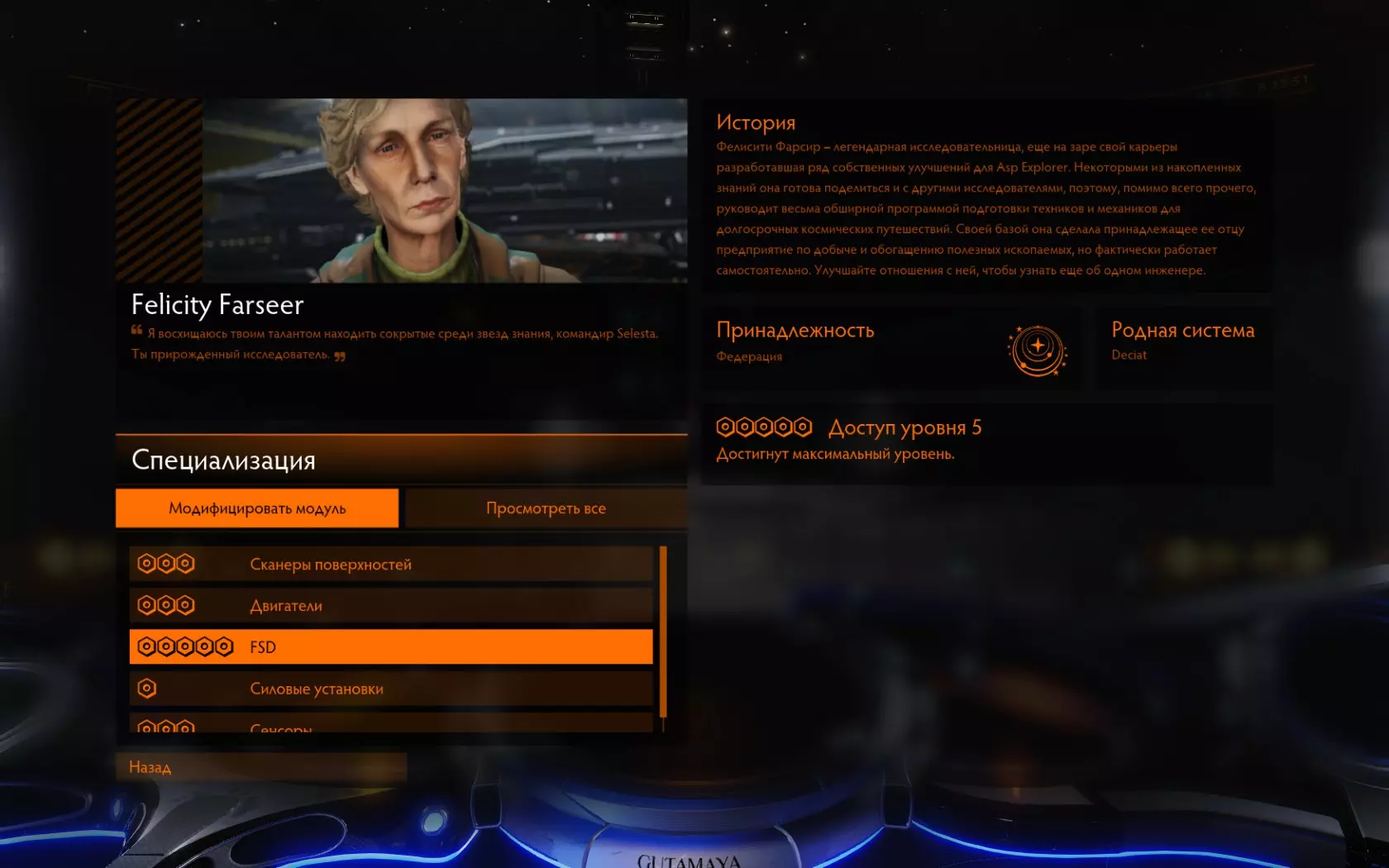 当新手玩家在游戏中克服重重困难,决定购买第一艘与“眼镜蛇”级飞船尺寸不同的“正式”飞船(例如“巨蟒”级或“阿纳孔达”级)时,就会面临如何正确升级飞船的问题,比如提升跃迁距离。本指南正是为这些新手准备的。 1. 开始 给新手的主要建议:不要进入开放游戏模式。首先,由于你在游戏中的经验不足,经常会给更有经验的玩家制造麻烦,所以他们在公开游戏中并不欢迎你。简单来说,他们不希望你加入。 其次,在那里只有蹲坑玩家(喜欢用各种方式骚扰他人的玩家)会“期待”你。他们不在乎你一无所有,也不需要从你那里得到任何东西——既不要赎金,也不要你可怜巴巴地求饶。他们只是想把某个倒霉蛋彻底干掉!所以,你可以选择单人游玩,或者创建一个私人队伍邀请好友加入,也可以加入好友已创建的私人队伍。只有在积累足够经验后,再进入公开游戏。 那么,你已经攒够了购买新飞船和保险的钱。 购买飞船前,请先确定你想要的类型:战斗无畏舰、货运运输舰还是探索舰?根据你的决定,开始为舰船“配备”相应的装备。首先购买并安装最合适的模块,然后再对这些模块进行升级。如果你将已升级的模块更换为“其他模块”,你将失去所有辛苦升级的成果,因为升级是附加在【特定模块】上的,而非舰船整体。因此,首先要购买你真正需要的模块。别忘了燃料收集器! 本指南将包含图片。若想更好地查看图片,请用鼠标点击,图片会在新窗口中放大显示。 假设你决定成为一名“未知未知事物”的研究者…… 游戏中你最早能接触到的工程师之一是菲莉西蒂·法西尔。她对新手探索飞行员最为有用,与埃尔维拉·马图克不同的是,她可以升级游戏初期最需要的模块。她的专长是升级框架转移驱动(FSD)的航程,这能让你的飞船单次跳跃距离显著增加。要获得她的研发成果,你必须先向她支付费用。作为“入门费”,她只接受合金,但由于年事已高且天生谦逊,她只收取【一个单位】的物品,因此你无需大量囤积合金。你只需要【一个】就行。除了法西尔奶奶,这东西基本没人需要。合金是稀有且稀缺的物品,所以不可能“随处”都能弄到。目前它们在Maia星系的Darnielle's Progress行星基地出售。该基地位于一颗卫星上,其周围环绕着Obsidian轨道空间站……因此很容易找到它。 再次强调——不要在公开游戏中前往那里……但这是你的事……我已经警告过你了。 好了,你登上了行星基地,为法西尔奶奶买了一块“幸福碎片”。