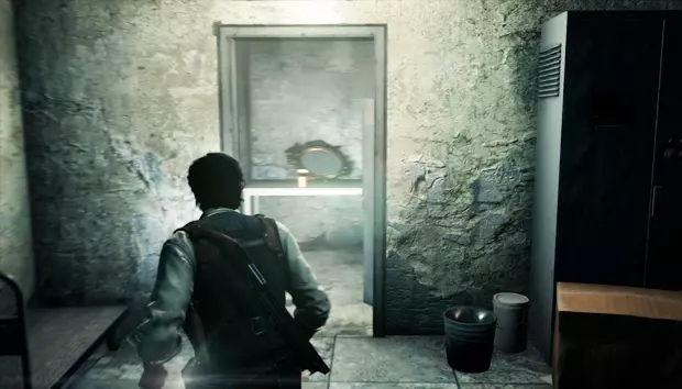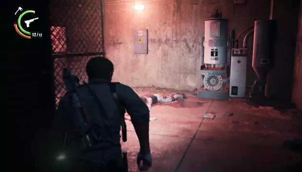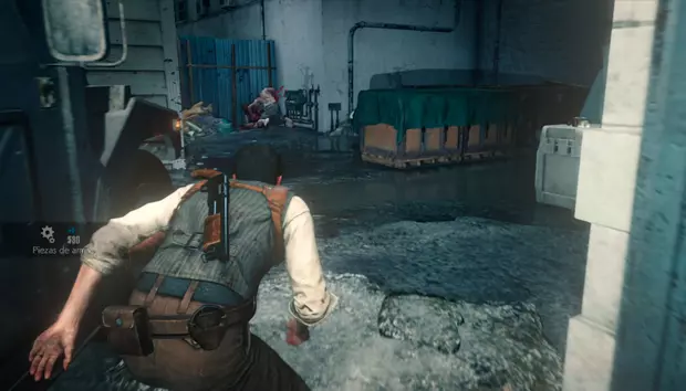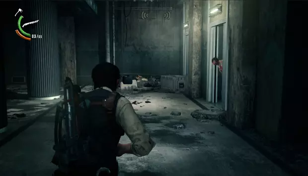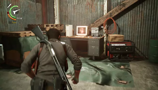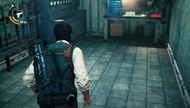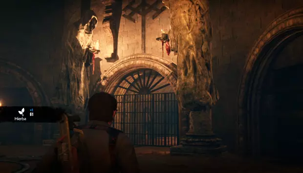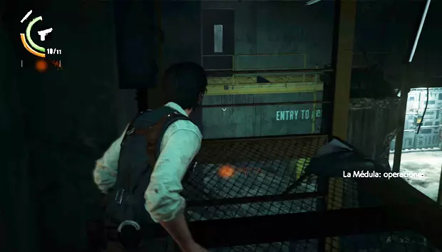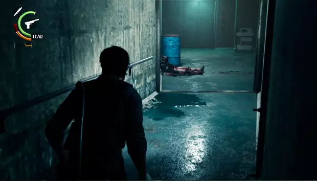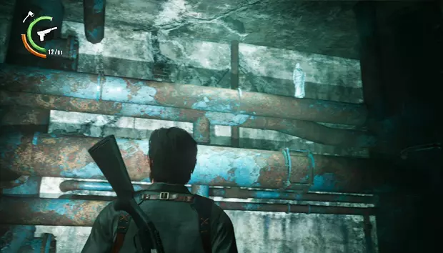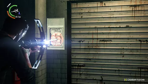 继续前进,你只能沿着一条管道走,旁边有一具尸体。管道的另一边,右侧会有一扇敞开的门,那个房间里有一扇带密码的门和一个小梯子。输入图案并击败敌人后,你就可以爬上梯子进入房间,获得一袋弩箭弹药。