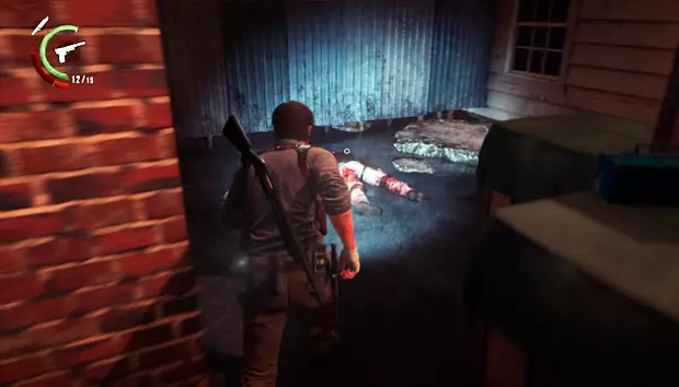 在下一栋建筑中,需要通过一段小楼梯上到二楼,击败敌人后一直走到尽头,那里会有一袋霰弹枪弹药。