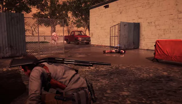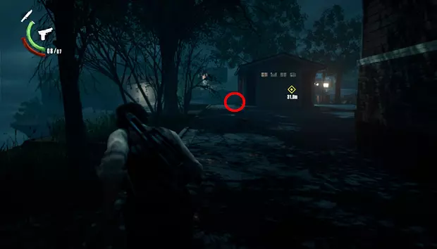 在外面,车间旁边需要跳过围栏,然后可以从尸体上拾取带激光瞄准器的手枪
