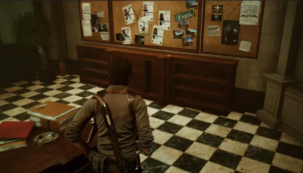 还会有一面镜子可以前往安全区域,这一点很重要,因为在塞巴斯蒂安的办公室里,线索板对面会有【第6号幻灯片】。