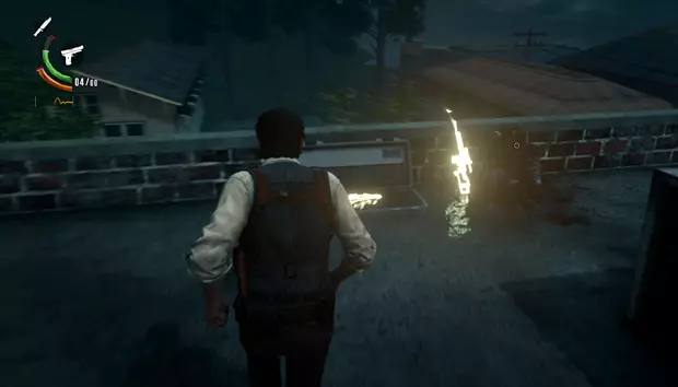 回到住宅区后,需要沿着那条街向右走,在第二栋房子后面的棚屋后面,可以爬上一段小楼梯,屋顶上会有神秘物品【神秘武器复制品】。