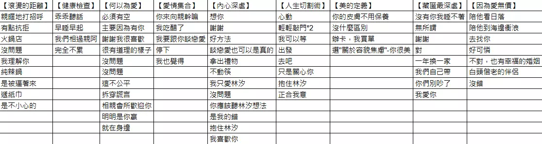 一起去吃个饭 火锅 走吧 是你太积极 都挺好吃你选吧 老婆饼里也没老婆 我挺不喜欢 你太瘦,多吃点 手打渣男 我可不是渣男 一起直播芝麻开门 这个时间还在训练啊 妮可必胜 和我出去吧 妮可男友上线了 我马上到 飞机晚点了 开玩笑的 你都不紧张我紧张什么 我要跟她开一把 你都夸下海口了 可以赢高端玩家 你想我在我就在啊 你让我住你家就行 逛宠物店