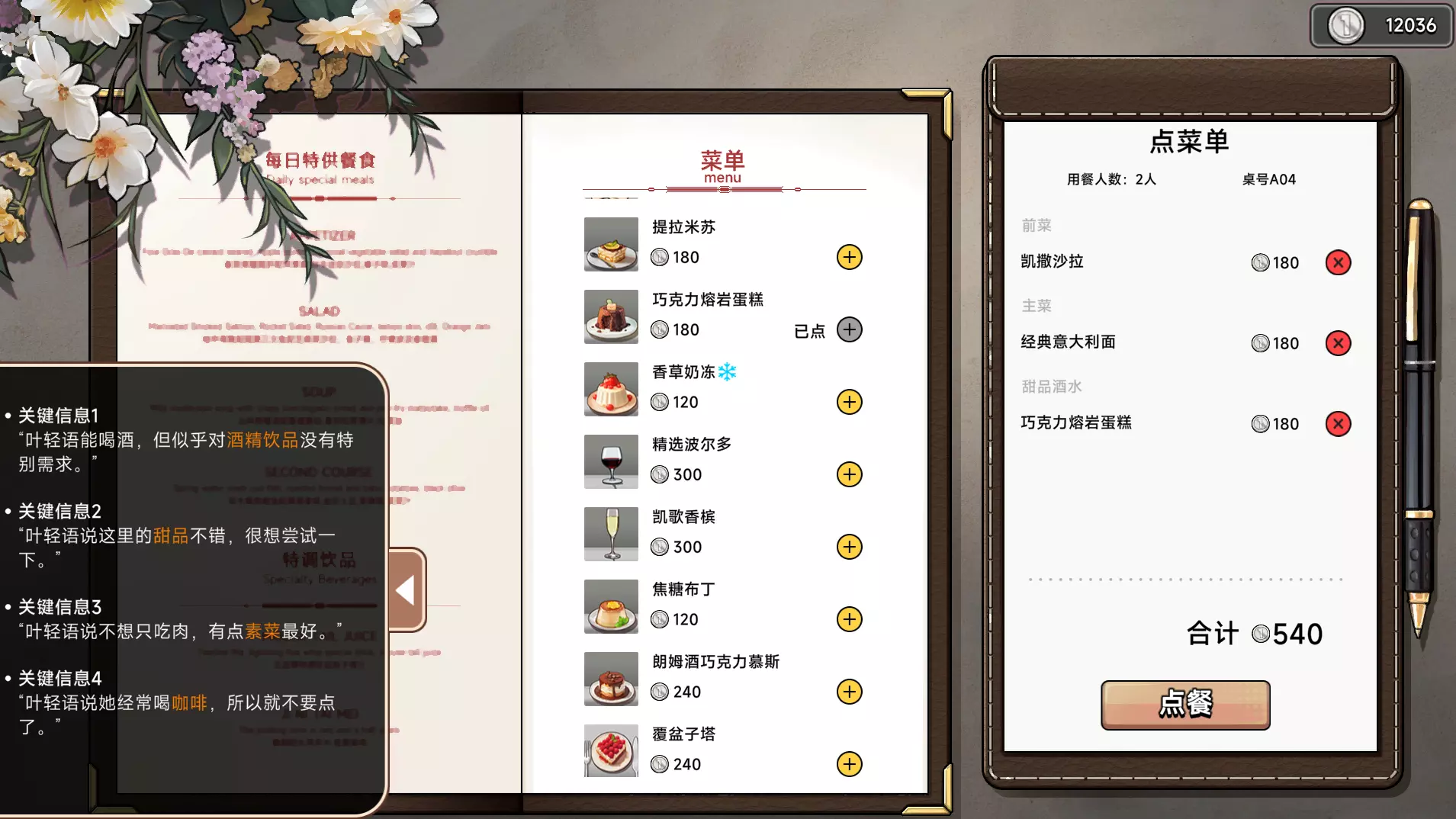 大概+100好感 一起吃个饭 高级餐厅 小礼物 你这么说也有道理 没想到你来这么早 他还是挺关心你的 看你喜好 我的也送你 情侣兔 去训鸽