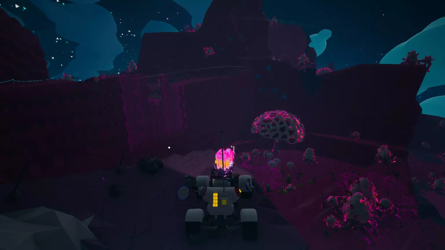 最重要的是,获取一台中小型打印机、一台熔炉,还可以选择配备一个研究室。尝试在附近的风暴峰寻找一些红土,然后将其熔炼成铝。现在制造一辆拖拉机和一些拖车。以下是我建议在上面安装的设备:首先,在前端安装一个RUBY(树脂+石英),然后建议在拖车上安装一些储物装置和电源。(RUBY使用时耗电5点)这就引出了下一部分——风暴! 风暴 风暴相当危险。如果没有任何防护,你会在几秒钟内受到攻击。共有3种不同的风暴:阿尔法(绿色)、德尔塔(蓝色)和泽塔(粉/红色)。它们的难度逐渐递增,包括地形更复杂、植物更致命、距离出生点更远、谜题更难解、隐藏的保险库更多,以及获得最大防护所需的数据量更大。要收集风暴数据,你需要一些载具。在上一部分,我已经告诉过你如何制作简单、廉价的风暴载具。在深入讲解风暴本身之前,我会推荐一些游戏后期使用的载具设计。 对于德尔塔风暴,你现在可以获取钨锰铁矿,进而获得钨。用钨制作化学实验室,然后收集一些阿尔法风暴数据,再获取另一块钨,制作便携式D密码器。这能让你在任务中直接使用风暴数据,无需存储,也不用返回基地。另外,尽量将野外避难所设置在靠近风暴的位置,以便快速进入。 对于最终的泽塔风暴,我建议使用更大的载具。是时候启用“大家伙”——大型漫游车了。我建议只造一辆,然后造一堆中型漫游车来降低成本,但如果你愿意的话也可以造更多。首先,装上你完成阿尔法风暴任务后获得的铺路机,然后制作一个1级钻头(陶瓷+碳化钨(钨+碳))也装上去。接下来给你的漫游车安装一个座椅,再装一个中型土壤和流体罐来储存土壤。另外两个位置,装上红宝石和便携式D密码器,它们会自动安装好。至于其他漫游车,就安装动力装置和储物装置,用来存放你在前往泽塔途中找到并想保留的物品。好了,现在该说说风暴本身了。这些风暴都非常相似,只是有些风暴里有更多危险的植物。首先,为了防止你立即被入侵,你需要找到一个保险库。用你的保险库探测器和指南针来帮忙。阿尔法的保险库就在你的基地附近,但其他的保险库则更难找到。德尔塔的保险库位于水晶洞穴生物群系,泽塔的保险库则在翠绿层。祝你能顺利到达那里,这过程会非常繁琐。接下来,获取一些风暴数据。你需要7个风暴数据来获得中等防护和反黑客密钥。要获得最大防护,则需要更多的风暴数据。阿尔法需要15个数据,德尔塔需要24个,泽塔需要32个。我建议你获取最大防护所需的数据,因为这在后续会很有帮助。现在,拿到反黑客密钥后,将其插入风暴眼的传送门密室中。你可能会知道接下来会发生什么。你需要完成一个与保险库类似的谜题。四处寻找放置缺失部件的位置。确保仔细查看传送门密室的内部和外部。接下来,用你的载具为其供电。别担心,所需能量不会增加。恭喜你,你已经完成了那场风暴,如果这是阿尔法风暴,那就和弗兰克的帮助说再见吧。 核心 当你完成所有风暴后,防火墙将会关闭,你必须前往核心。使用你的风暴漫游车向下挖掘,穿过水晶洞穴,穿过翠绿层,然后穿过核心区域。一旦你到达核心,你会发现一个奇怪版本的日光室。