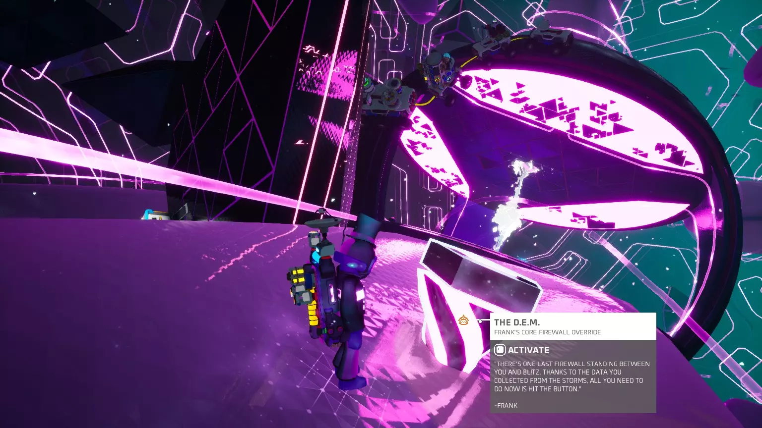 现在你必须找到弗兰克放在附近的DEM。它可能在核心区域那些奇怪的机械臂装置中的一个上面。