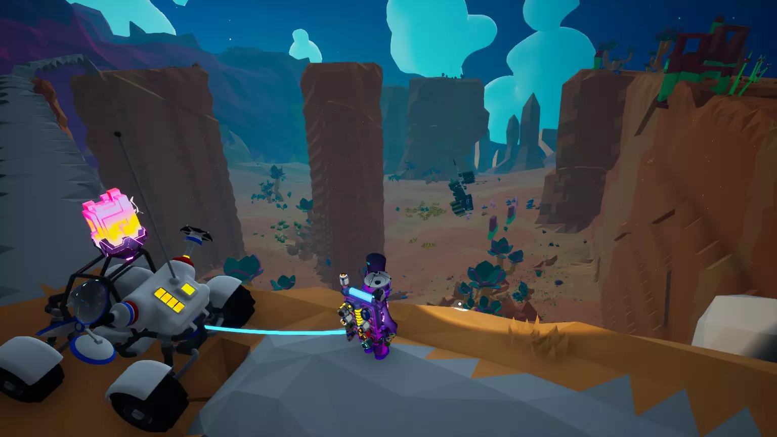 赛博峡谷的特点包括: 呈浅橙色 大型峡谷 峡谷内外地势相对平坦 植物群类似沙漠/稀树草原 资源包括有机物、化合物、树脂、石英、黑钨矿和石墨 峡谷内有巨大的石柱,高度延伸至峡谷外部 危险植物包括毒雾草和爆裂珊瑚 最后是风暴山峰