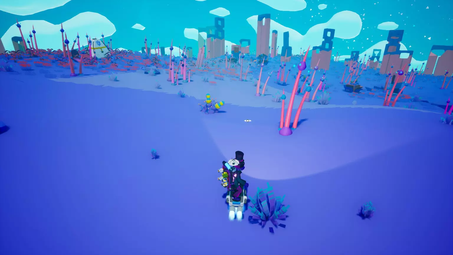 布尔区域的特征包括: 主要为浓郁的宝蓝色,带有橙色和粉色的色调 鞭叶是这里唯一的危险植物 奇特的立方体遗迹/构造 你着陆的生物群系 许多小型植物 相对平坦 资源包括化合物、树脂、有机物和石英 接下来是聚合丘陵