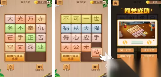 这款偏向于轻松休闲的全民向华容道游戏,有超过500关的关卡,难度会平稳的上升,每一个阶段都有新的机制,并不会突然的卡关。还有新手关卡加上步骤提示,迅速就能理解滑块的逻辑,对于玩家而言完全可以零门槛上手。一旦在过关之后就可以解锁皮肤以及勋章,这种轻量养成的感觉,就能迅速的提升动力。游戏没有时间的限制,更加没有失败惩罚,很适合放松大脑。 高速下载 普通下载 优先233乐园APP下载 3、《成语华容道》