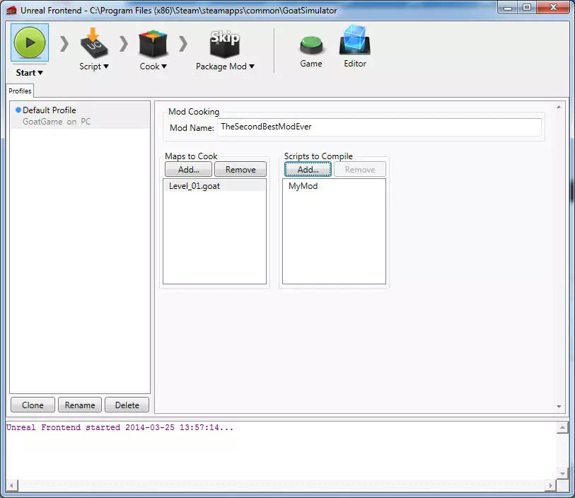 重要提示! 地图名称中不要使用空格! 保存地图后,请使用Unreal Frontend。在这里,你需要为你的模组命名一个合适的名称。确保同时选择你要烘焙的地图。如果无法找到你的地图,可能是因为你给地图命名错误。地图名称必须以.goat为后缀。如果地图名称正确但仍然不显示,请确保它被放置在正确的文件夹中。正确的文件夹路径是..GoatSimulatorGoatGameContentMaps。完成这些后,只需点击绿色的开始按钮。 如果一切顺利完成,你可以按下【打包模组】按钮。这将把你的文件放置到正确的位置,即..GoatSimulatorGoatGameModsMyMods%modname%。 就快完成了!查看其他教程了解如何将其添加到游戏中。创建突变器 突变器本质上是一个包含代码的文本文件。我们提供了GGMutator作为突变器的基类,并包含一些《模拟山羊》特定的钩子。 钩子是指在游戏中特定事件发生时被调用的函数,以便你可以修改应发生的事情,即“改变”行为。 首先,你需要在游戏根目录下的开发src文件夹中创建一个目录。游戏根目录通常类似“C: Program Files (x86) Steam SteamApps common GoatSimulator”。这个目录可以命名为“mymutators”或其他任意名称。 在该目录内,你需要再创建一个文件夹,且必须命名为classes。现在,你的工作目录结构应如下:“..”开发Src MyMutators类 这里是你创建自定义变异器的地方!现在就开始创建吧。你可以通过创建一个常规文本文档来实现。将文件命名为你想要的变异器名称,并将扩展名设置为.uc。例如,我们创建一个名为MyMutator.uc的文件。 现在你可以用任何你喜欢的编辑器编辑这个文件,甚至可以使用记事本。打开文件并在开头添加以下内容: "class MyMutator extends GGMutator;" 现在你就可以开始编写代码了! 要查看可用的钩子,可以查看: "Development Src Engine classes Mutator.uc" 和 "Development Src GoatGame classes GGMutator.uc"。 要使用这些钩子,你需要在你的类中重写函数。如果你要这么做,请确保同时调用父类函数!因此,如果你想在任务完成时执行某些操作,你应该重写: function OnQuestCompleted( GGQuestBase completedQuest ) { //在此处放置你的代码 //调用父类函数 super.OnQuestCompleted( completedQuest ); } 如果不这样做,可能会破坏其他修改器,这可不太友好! 我不会深入介绍实际的编码细节,这需要你自己去探索! 当你对自己的修改器满意后,需要编译脚本。从Steam启动【模拟山羊】开发工具包。