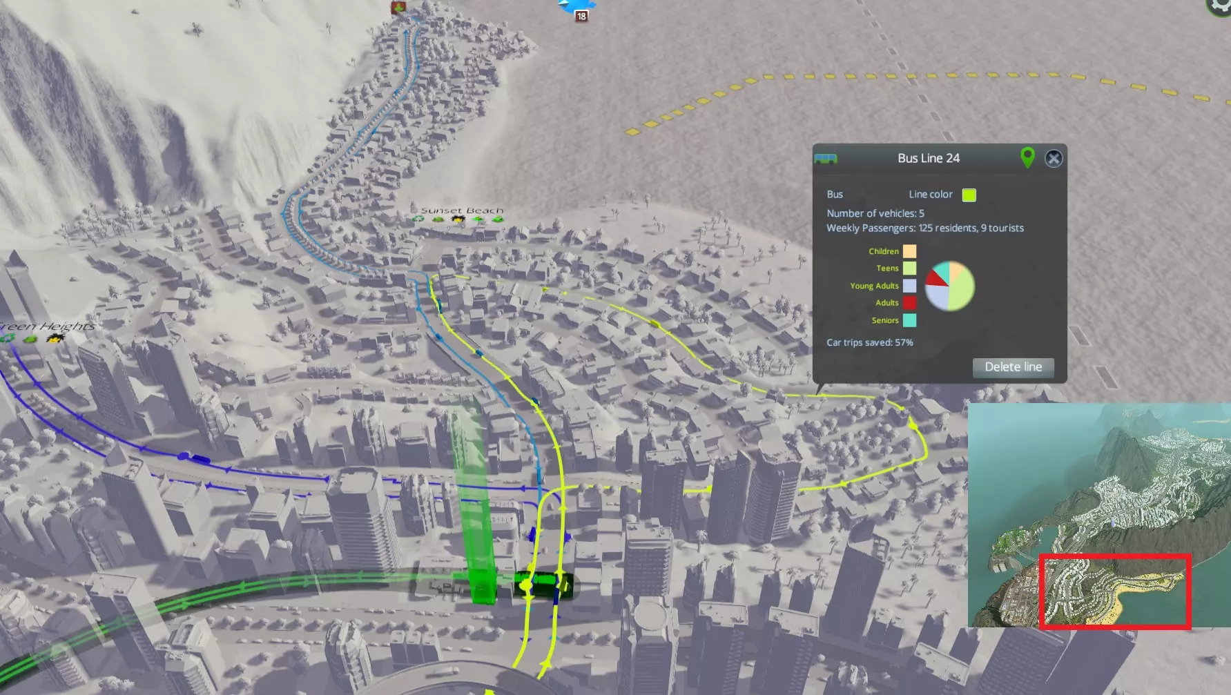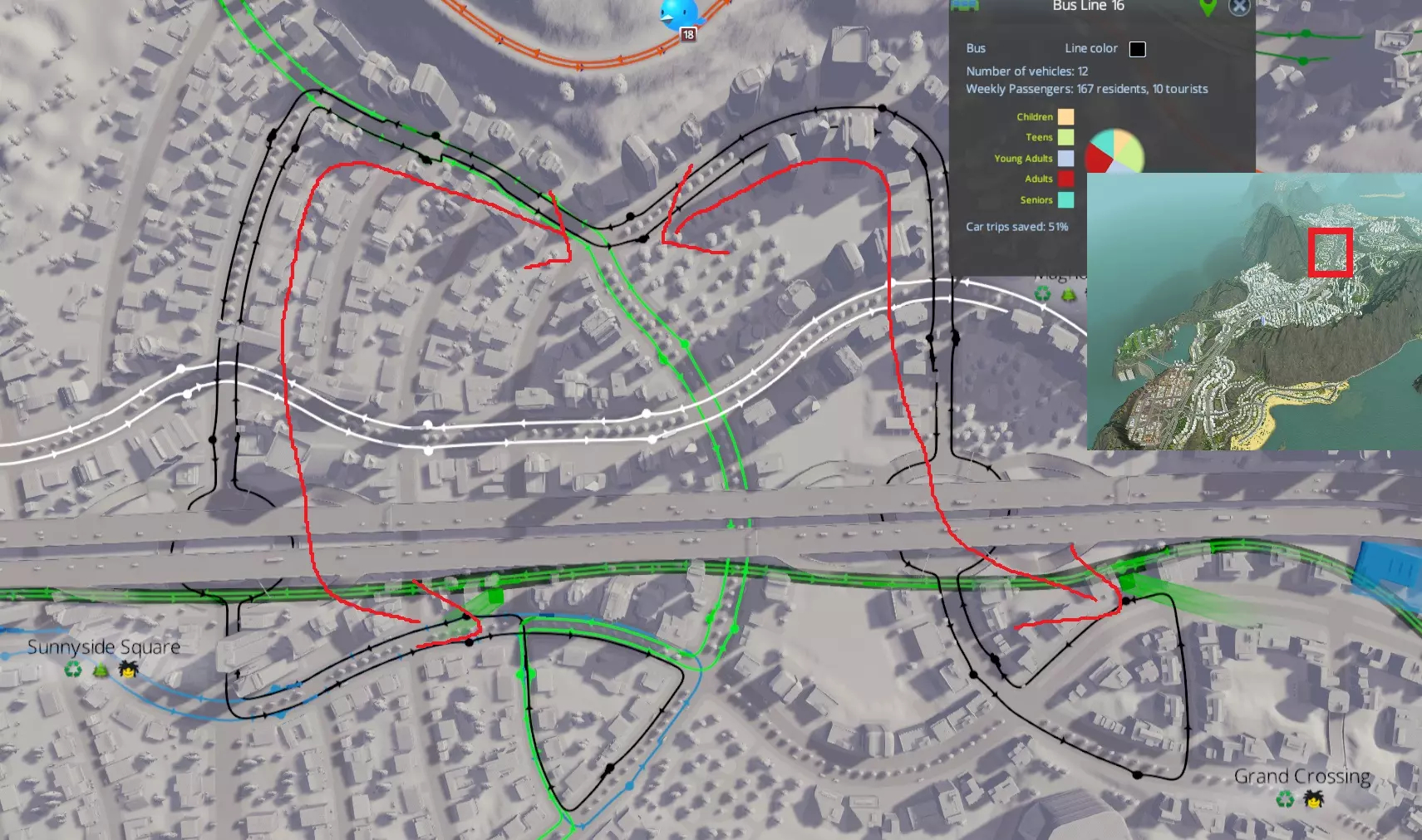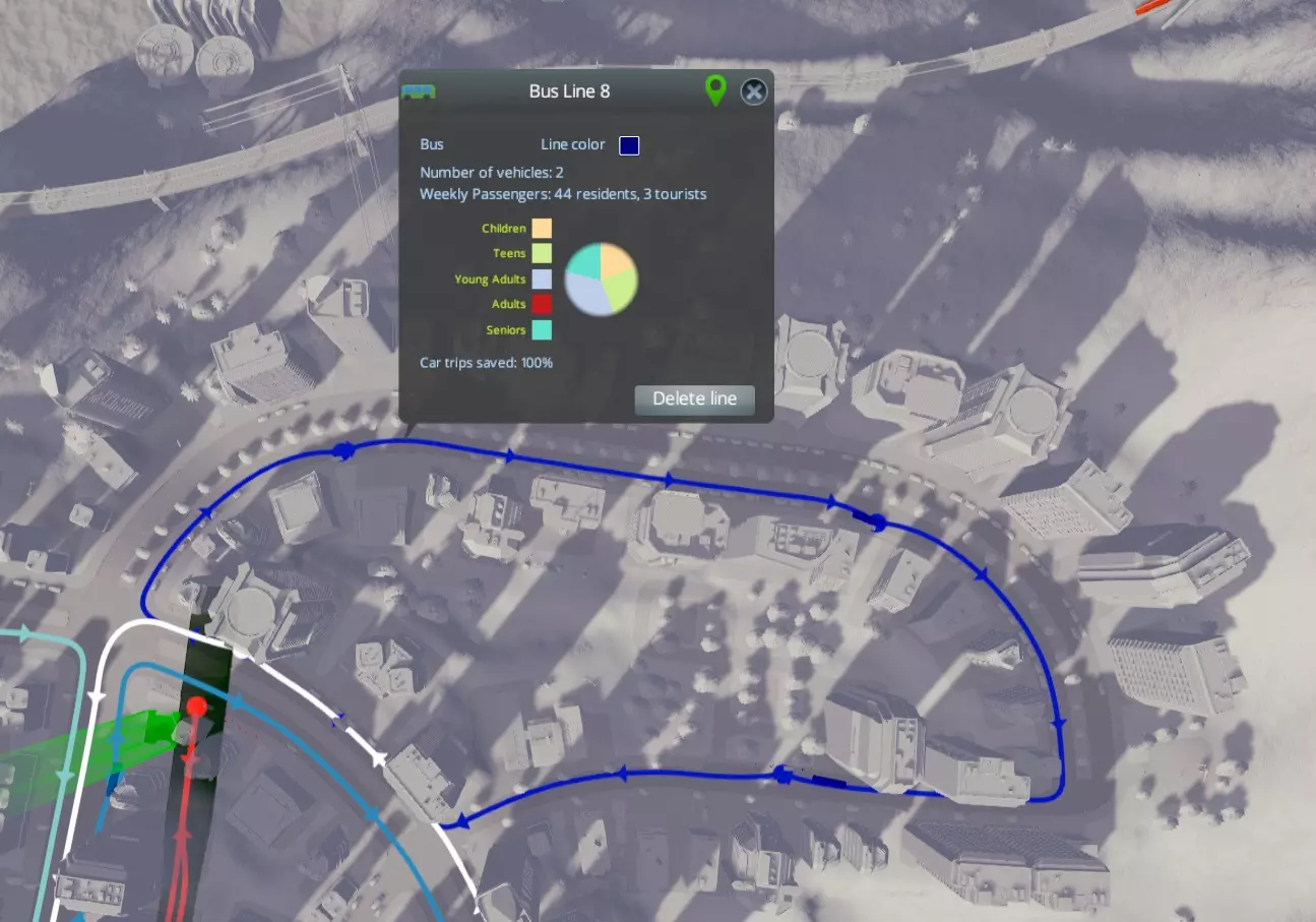 这是另一个循环线路,同样实现了100%的行程节省。它的距离短得多,因此增加第二条线路节省的时间并不多。而且它的成本效益更高,每辆公交车能搭载四倍的乘客。我希望能够手动调整每条线路的公交车数量……或许在未来的更新中会实现。 无论如何,你会注意到在上述两张图片中,这些循环线路都与其他几条线路相连。如果没有这些连接,它们根本不可能达到100%的行程节省,因为唯一可行的行程只能是在住宅区内部,例如拜访邻居。这就引出了…… 将你的公交线路连接成网络