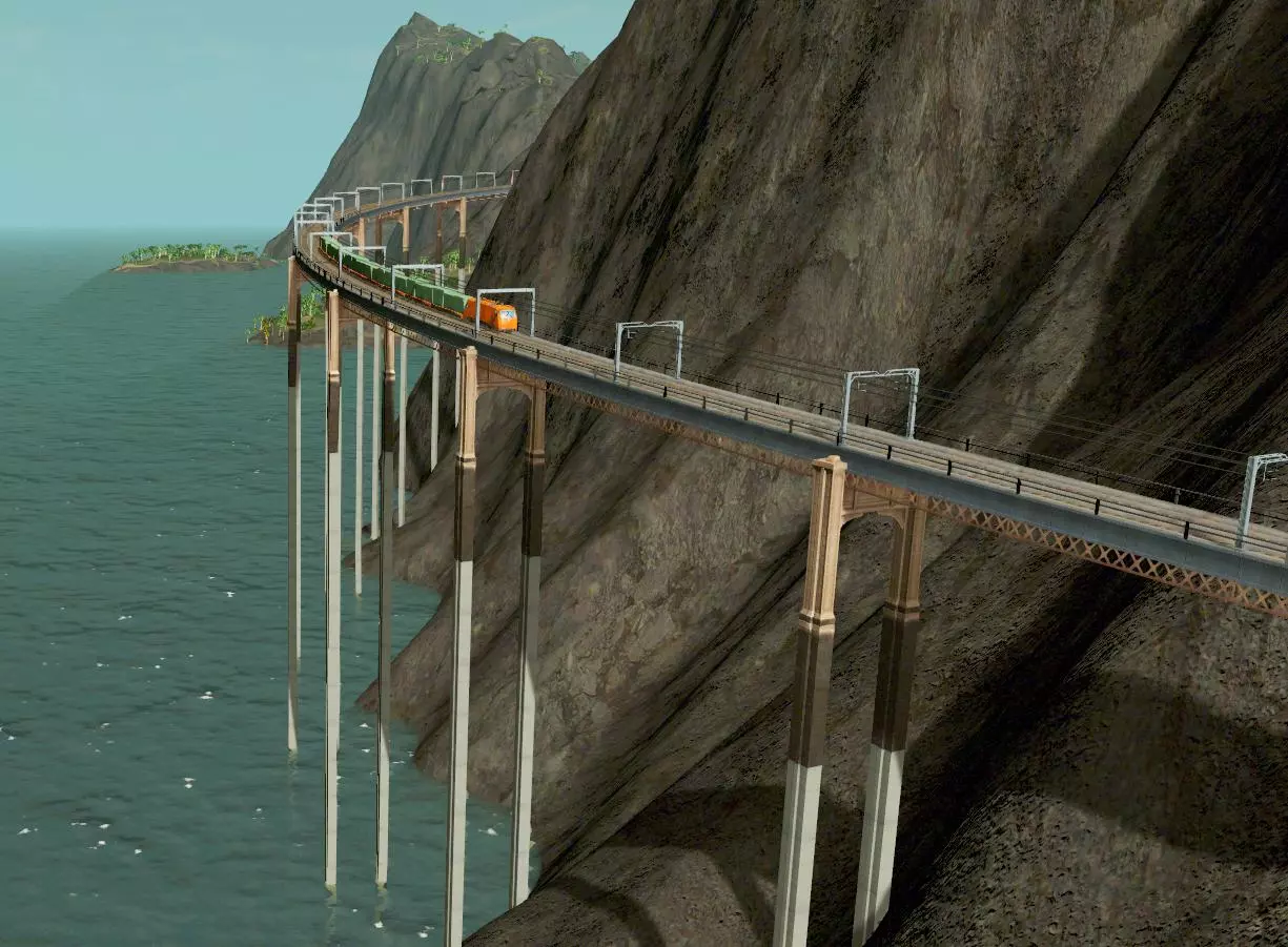 这条铁路线的修建是为了服务大型工业区(箭头下方)以及邻近的居民区。在现实世界中,这完全合理,因为火车的建造和运营成本远低于地铁,因此是将交通网络延伸到或穿过人口密度较低区域的更具成本效益的方式。遗憾的是,我刚刚意识到在【城市:天际线】中情况并非如此,其相对于地铁的优势如下: - 建造成本略低(但运营成本更高……这就奇怪了。两者实际上是相同的轨道,只是没有隧道而已) - 借助桥梁,更能适应地形 - 容量略高 - 观看体验更有趣