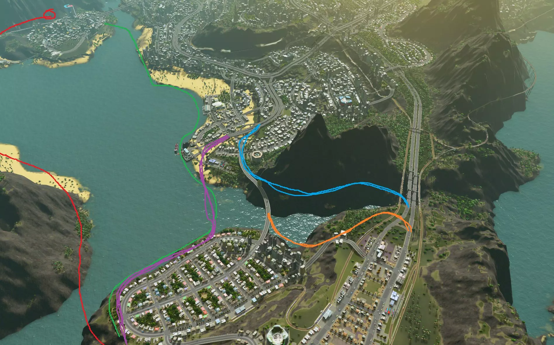 就像道路一样(我之前也说过),公交线路的高效运行需要层级结构。通常是地铁或火车服务整个区域,公交车连接各区域内部,而在当地道路上则是舒适的步行。 上面的图片传达了这个理念,但**过于理想化**。我能想到的唯一直接适用的情况是,你的城市密度极高、是完美的网格布局,并且形状像一个细长的矩形。 我说密度高,是因为地铁站间隔太近效率并不高:火车能载很多乘客,但加速和减速都很慢,所以减少停靠站是好的(这在游戏中可能不如现实中那么绝对,但对我来说似乎足够相似)。还有一个问题:如果你想从一条公交线路的终点前往相邻线路的终点该怎么办?乘坐公共交通需要绕很长的路。 简单来说:如果你想为一个真实存在的城市构建交通网络,就必须根据现有条件调整这个简单的想法。幸运的是,我正在玩的地图【Raerai's Cove】(由Steam用户aKiss4Luck或Eva制作),结合我相对即兴的游戏风格,提供了多种需要应对的场景。 注意:以下内容按照上述优先级从高到低排列。虽然你或许应该按此顺序规划,但在游戏初期,从公交线路开始建设可能是更具成本效益的选择。 区域网络
