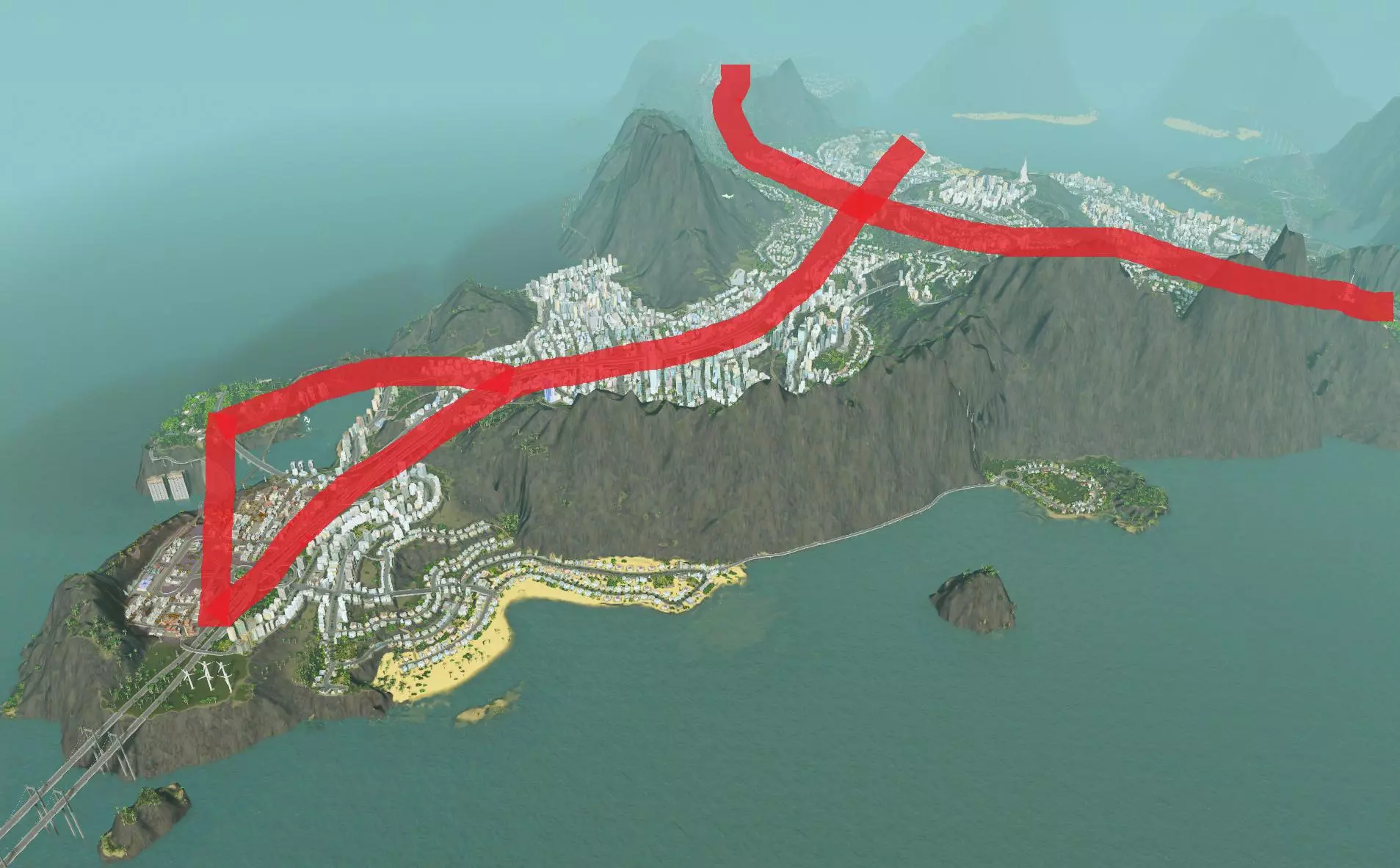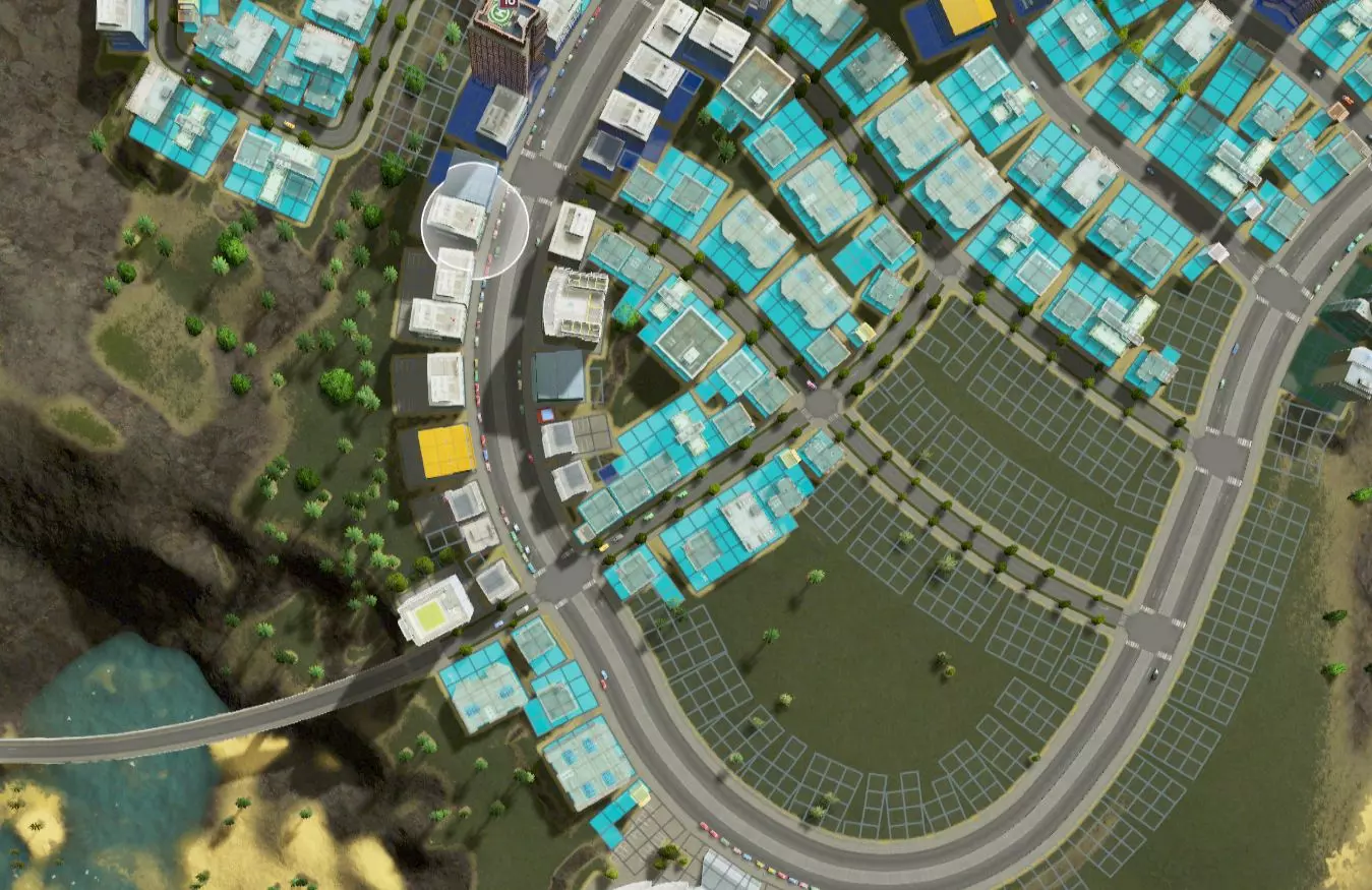 上述过程大约花费了我12个小时,现在我已经没什么精力来写本指南的问题解决部分了。但我也不想让大家失望,所以我会跳过那些相对简单的问题,直接来讲一个我花了两个多小时才解决的难题。 我事先声明:这个解决方案可能有点平淡无奇。不过,中间的步骤包含了我大部分的技巧,希望你能从中获得一些有用的东西。 当时,我正在将我的城市扩展到一片新的土地上。我短暂休息了一下,欣赏着自己目前的成果,然后……