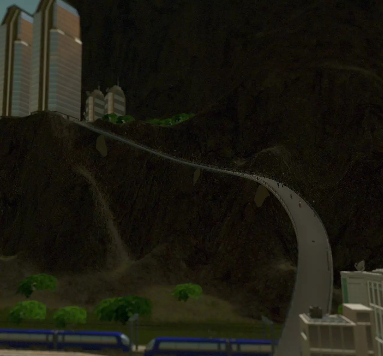 这是与上文相同的区域,但视角更大,为鸟瞰图。如你所见,市中心上方的区域仅通过最左侧的道路连接。该斜坡过于陡峭,道路无法直接下行(至少不经过大幅蜿蜒是不行的),而绕行的距离对于市民来说又太远,他们不会考虑。公交线路可以将山坡与底部的火车站和地铁站连接起来,但考虑到从技术上讲,这些地方其实在步行范围内,所以这样做有些浪费。 幸运的是,人行道规模更小,能够急转弯,并且可以比最小的道路更陡(可以想象成楼梯,尽管你看不到楼梯)。额外的好处是:市民对于在日常通勤中进行100米的垂直攀爬毫无怨言。实际上,这些路径几乎零成本地扩展了下方车站的覆盖范围。