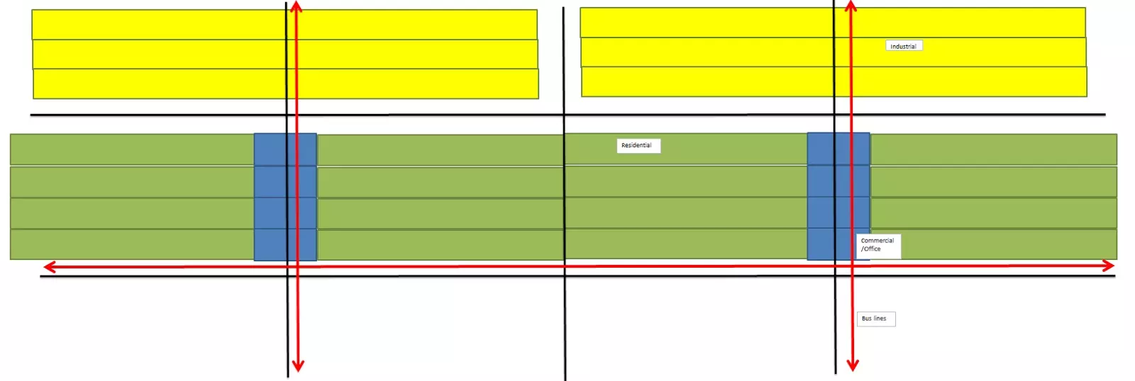 这条黑色线路我最终用得很多,主要是因为两侧的山脉限制了城市向主干道以外的区域过度延伸。 从功能上来说,它相当于两条线路(如红色箭头所示):在两侧,如果你想去地铁站,只需选择合适的方向就能找到最短路线。此外,由于它部分路段与地铁平行,提供了一些直接套用上面理想示意图所无法实现的互联互通性。 绿色线路的基本思路相同(尽管大部分在屏幕外)。向南,它是通往大型低密度住宅区的主要通道。向北,它起到了与黑色线路相同的“相当于两条线路”的作用,不过连接的是另一条地铁线路。