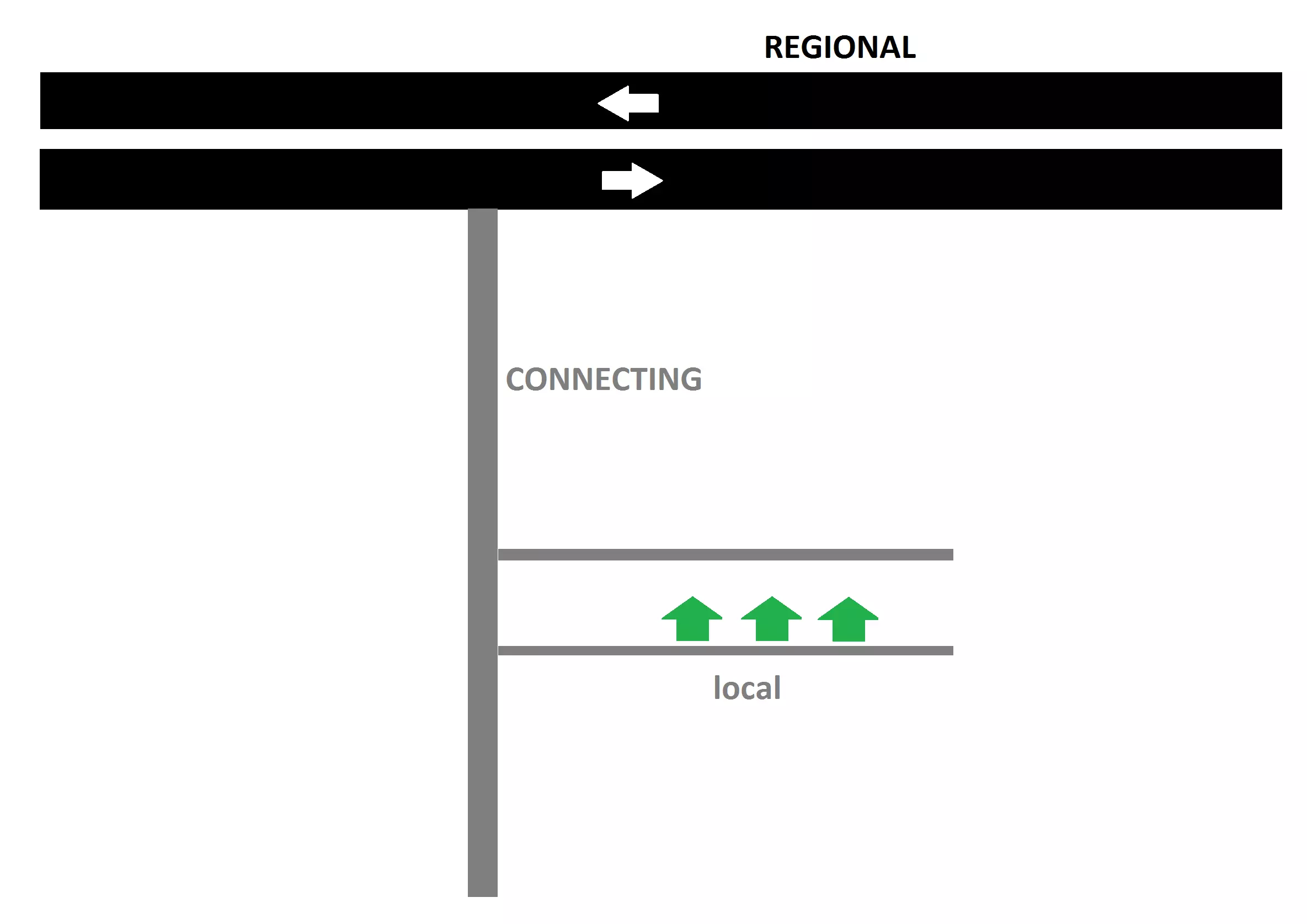 教科书式的基本理念是将道路网络简单分为三个层级:本地道路(双车道)、连接道路(四车道和六车道)以及区域道路(高速公路)(实际上还有第四个层级——国家道路,在游戏中表现为外部连接,但由于我们无需建造它们,所以可以忽略)。这种结构与现实中几乎所有城市的道路建设方式一致。 本地道路应是大多数居民的居住地;它们基本上是车道的延伸,能让你接入真正的道路网络。它们本身不会带你去往任何地方,或许只能到街角的商店。 连接道路用于在社区内通行。它们更宽、车速更快,在交叉路口,使用连接道路的车辆比使用本地道路的车辆拥有更高的优先通行权。不过,你仍然可以在连接道路旁居住或工作。区域道路甚至更快:没有交叉路口,没有车道出入口,限速高。高速公路显然符合这一特点,但任何类型的道路只要建造得当也能满足这种描述,例如用一条每隔数百米才有交叉路口的六车道道路连接城市郊区。