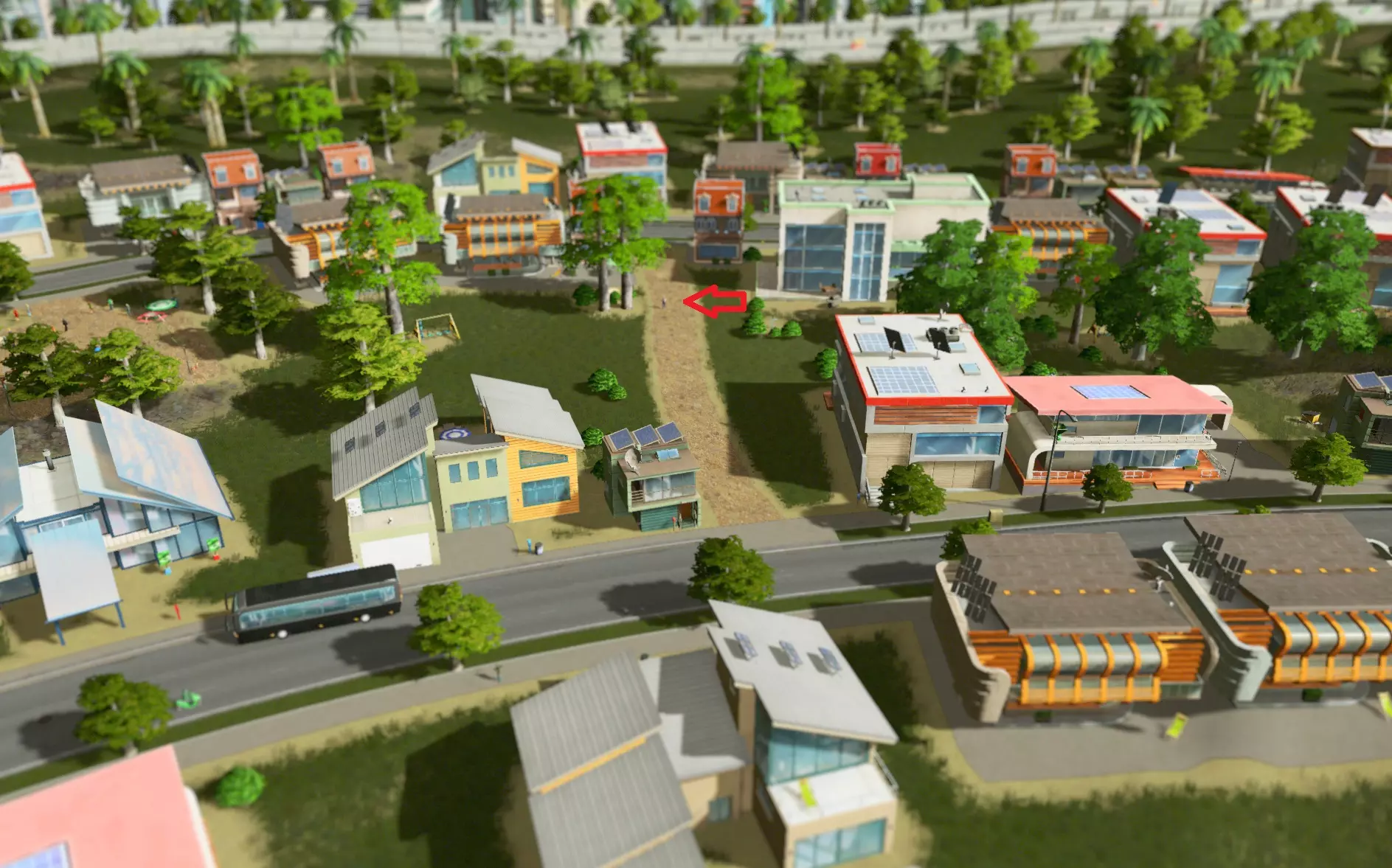 当然,它们的用途并不局限于陡坡。在这个低密度区域,街区很长,通常要走到有公交线路的那条街上会很不方便。虽然我本可以用道路分割街区来让行人通过,但修建专属人行道再次成为了更经济且美观的选择。 它们较窄的宽度还能让你在居民区中规划路径时将破坏降到最低。你通常可以把它们挤在现有建筑之间(除非你使用的是网格布局,这种布局中不存在这些空隙)。 不幸的是,不管有没有人行道,那位老人似乎还是错过了他的公交车 :(