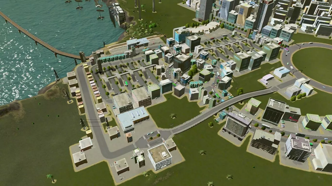 关于工业方面还有最后一点,可能不是那么显而易见:货物可以走一些相当巧妙且复杂的路线。比如,货运港口旁边就有一个火车站;火车将货物从城市各处运到该车站,然后车站会派出卡车将货物运往船只。港口在处理进口货物时也是同样的流程。 需要注意的是,这会在它们之间造成非常严重的交通拥堵。我给它们设置了专用的入口坡道。如果火车能直接将货物卸到船上就好了,但目前只能这样。 总之,以上就是我目前能想到的总体策略。最后我再提几点关于公共交通的内容。