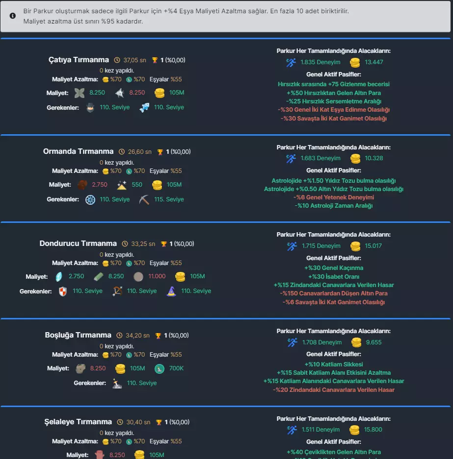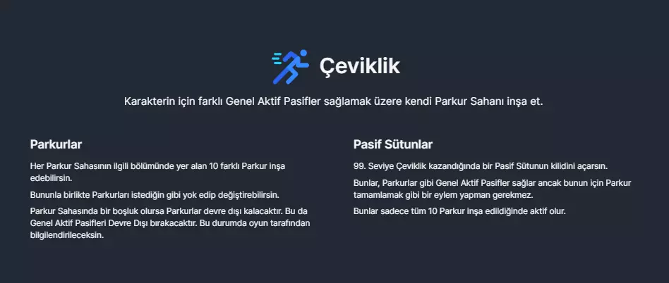 灵活性 建造跑酷场地以提供多种不同的通用主动和被动技能。 每个跑酷场地都有不同的被动技能。