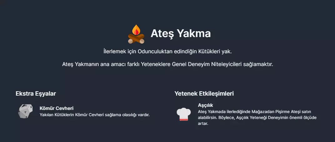生火与制火技能通过升级来解锁更高级的烹饪火堆并制作煤炭矿石。以下是所有烹饪火堆的相关信息