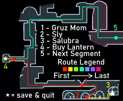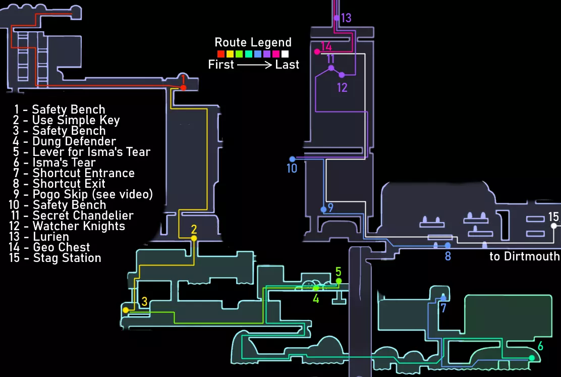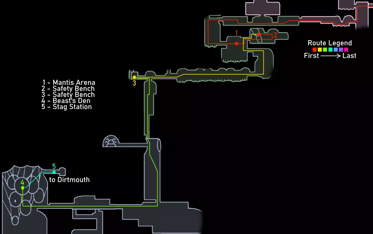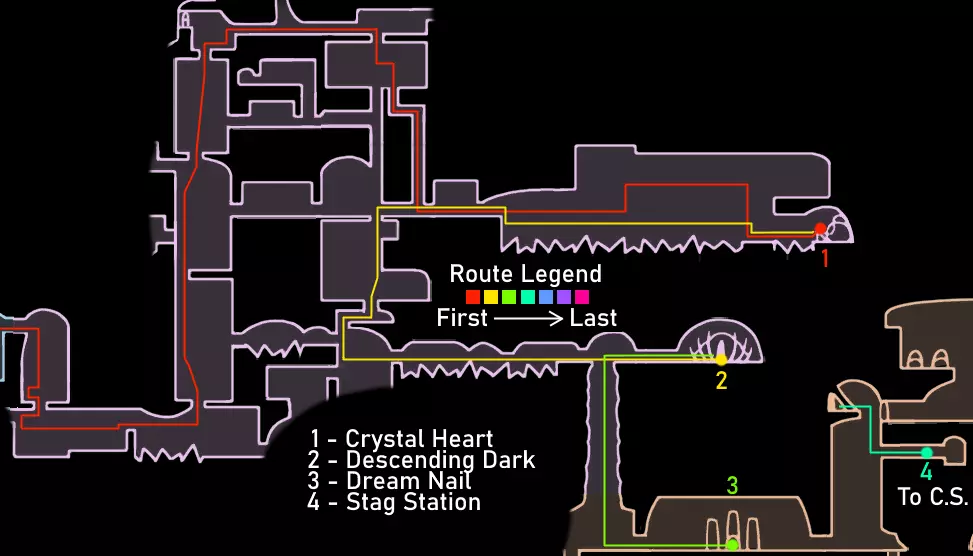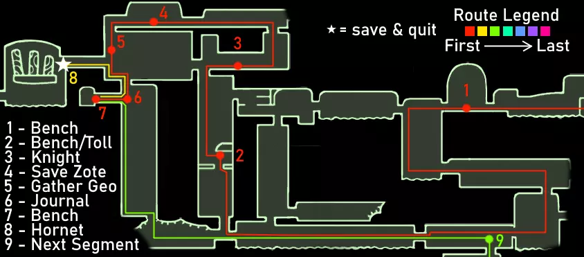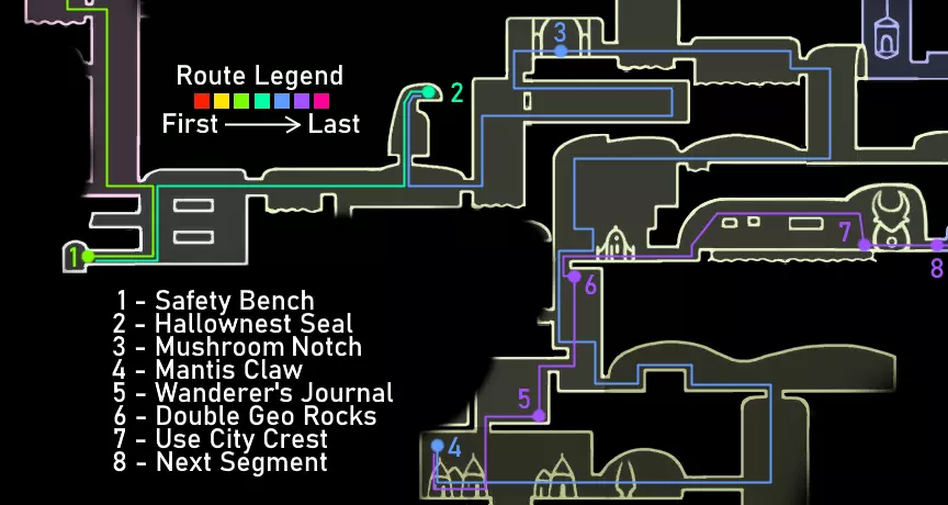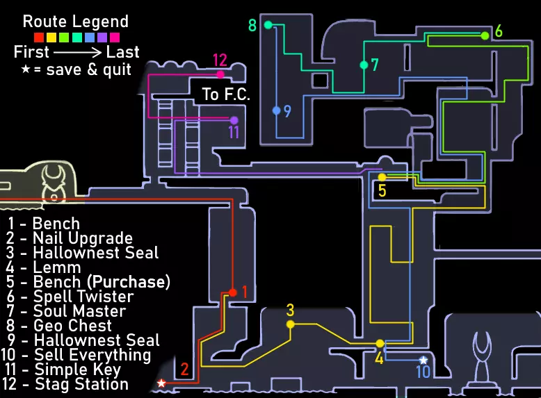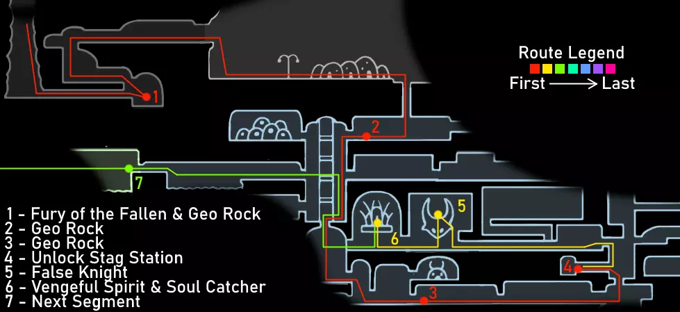 重要提示 如果你已经看过视频,可以跳过这些内容。 始终将安全放在首位,而非速度。时刻保持生命值满格。坐在地图上显示的长椅上,因为虽然跳过长椅能节省一点时间,但如果死亡,你会损失更多,还可能失去你的吉欧。 通过 relics(遗物)和宝箱获取吉欧,而非普通敌人。刷普通敌人效率低下,不要浪费时间。这条路线收集的吉欧已经超出所需,并且通常在容易死亡并丢失暗影的区域不会携带太多吉欧,所以不必过于担心吉欧。尽量避免死亡和损失即可。 不要获取其他护符;如果你觉得需要,可以获取额外的能力或面具。萨满之石是游戏中最好的护符,而扭曲法术与它的协同效果极佳。我建议一直装备这两个护符。如果你觉得需要提升攻击力或移动能力,可以获取额外的面具、钉子升级2、帝王之翼或暗影之魂。 要大量使用你的法术,并且要知道如何使用它们。法术对击杀 Boss 极为有效。下砸暗影非常强力,施法后拥有无敌帧。再次施法会取消这些无敌帧,所以在尝试施放另一个法术之前,一定要移出敌人的攻击范围。 暂停会停止计时器。速通社区的一些模组制作者检查了游戏代码,确认暂停会使游戏内计时器停止增加。如果你需要休息或查看地图,请务必先暂停游戏。 路线概览 击败假骑士并获得复仇之魂。 击败大黄蜂并获得蛾翼披风。 获取螳螂爪。 获取1级钉刃强化并击败灵魂大师以获得荒芜俯冲。 出售所有遗物。与斯莱对话,从萨鲁巴处购买物品,并购买光蝇灯笼。 获取水晶之心、下砸黑暗和梦之钉。 击败粪虫防御者并获得伊斯玛的眼泪。 击败守望者骑士和卢瑞恩。 击败乌姆和莫诺蒙。 击败赫拉。 击败空洞骑士。 路线指南 如果难以看清图片内容,可点击图片进行放大。 第一阶段:复仇之魂