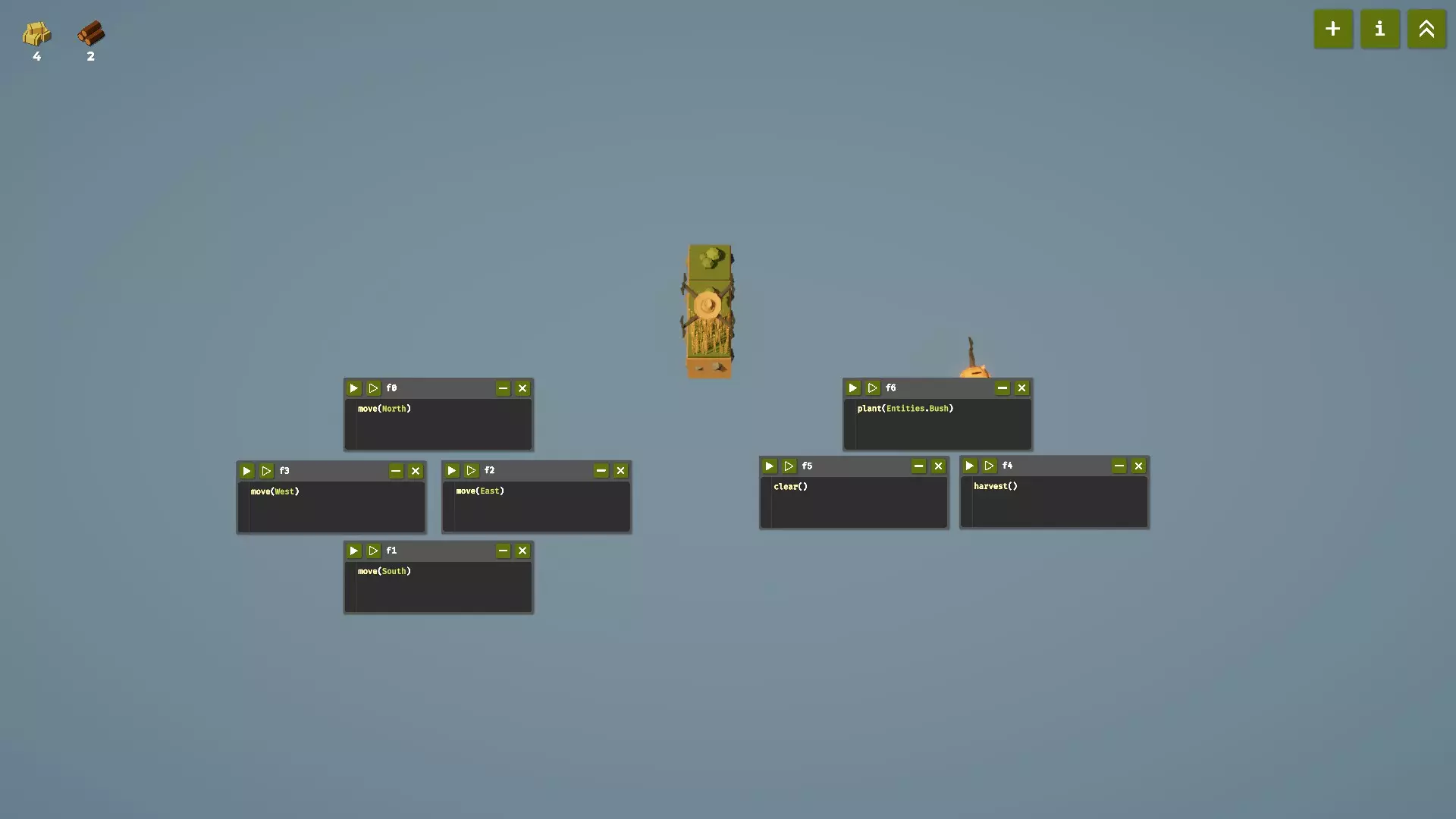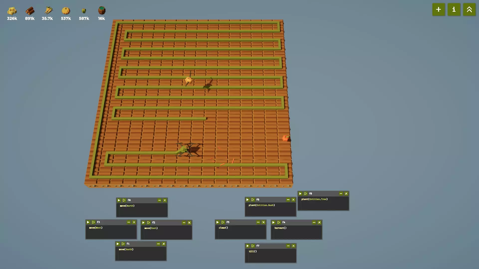 for those about to code はじめに 農家は Replace() されましたはプログラム学習に良いソフトだけど、初心者には基本的な説明がかなり不足していて、説明する人がそばにいないとなかなか前進できない感じなので、とりあえず書きます。 harvest 1.右上の+マークでコードを書く画面を開く。 2.そのウインドウでhaと打ち込むと予測でharvestと表示されるのでEnterキーを押す。 3.Shiftキーを押しながら数字の8と9のキーで()を入力する。 4.Enterキーを押して改行する。 コードf0 harvest() ポイント 英語入力でないとダメ 小文字でないとダメ 勝手に間隔や余計な文字を入れない これで命令文が完成したので、三角の再生ボタンを押すたびにコードが実行されて、harvest()の収穫命令が1回実行される。 5回収穫したら、右上の上矢印2つの昇進アイコンを押して、whileをアンロックする。すると、whileループがどういったものか説明文が出るので適当に読む。 また、画面右上のiアイコンを押せば、今利用可能な命令文を見ることができる。コードを書く上で、その命令文がどういった動きをするのかを理解することはとても重要なことなので、定期的に読み返そう。ただし、コンピュータ相手とはいえ、所詮は言語なので、真剣に読んで100%覚えていくスタイルだとまったく進まないので、ぼーっと生きてないとダメ。英語でhelloと話しかけられたら、helloと何も考えずに返す。Hから始まり、エロが続くとは何事か!と5歳児の様に考えるとダメな大人になるのでお勧めしない。言語学習は原理や理論ではなく、従順さが一番。 while f0のコードのharvest()の部分をコピペして harvest() harvest() harvest() harvest() harvest() 5つharvest()を書いて三角実行すると、5回収穫できる。けど見た目が明らかにアホみたいなので、whileループの繰り返し命令を使って書き直す。また、コードは上から下に順番に実行されるので、 do_a_flip() harvest() harvest() と書くと、フリップをした後に、2回収穫をして、 harvest() do_a_flip() harvest() と書くと、収穫をして、フリップをして、収穫をする命令になる。 コード while True: harvest() ポイント whileは小文字 TrueのTは大文字 間にはスペースを1ついれる :はコロンで、;セミコロンではダメ。 先人が書いてる見たまんまを黙って書く。勝手に小文字と大文字を変えたりしたら、それだけで上手く動かない。while True:でEnter改行すると、自動的にtabキーを押した間隔が挿入されるので、whileの下はTabの空白がある状態でharvest()と書く。pythonの言語では、この間隔インデントが重要な扱いになっていて、インデントがあるとそれらの命令文がwhileループに属した命令になる。pythonはC言語とか他の言語と比べ、あまり{かっこつけない}で、インデントで済ますためインデント欠落はバグに直結するので注意しよう。 例えば、 while True: harvest() do_a_flip() だと、収穫してフリップをするの2つの動作を繰り返すが、 while True: harvest() do_a_flip() とすると、whileループのインデントにはharvest()しか含まれてないので、収穫のみを繰り返し、フリップの命令文までは到達できない。 とりあえず50のワラを回収したら右上の昇進アイコンから、スピード20と拡大30をアンロックしよう。 move これまで書いたコード画面は全部Xで閉じて、+マークでコード画面を開きなおし、 コードf0 move(North) と書こう。押すたびに北に1歩移動する。 もう一度+マークからコードウインドウを開いて、 f1 move(South) f2 move(East) f3 move(West) 同じように+を押して4つのコードを書いて十字キーの様にウインドウをドラッグして並べれば、コントローラの様にドローンを動かせる。 f4 harvest() も追加して十字キーの右側に配置すれば、最強コントローラの完成。それぞれの再生ボタンを押せば、自由自在にドローンへ命令が出せる。 ポイント 小文字と大文字は書き分けないと上手く動かないバグになる。 土地が狭くて、東西には移動できないから、50収穫してBushをアンロックしよう。Bushをアンロックしたら+マークから f5 clear() の命令ボタンを追加配置しよう。この命令は北に行ったり、何か別のものを植えていても、農場を初期化し、(0,0)の原点座標に移動する命令になる。 f6 plant(Entities.Bush) ポイント 同じく、小文字と大文字、.と,の間違いも注意。 ここまでの7つのコードウインドウをコントローラの様に並べて、ドローンを自由に動かしてみる。ブッシュを植えると、ゆっくりと成長して、成長し終わった後にharvest()を実行すると、木が収穫できる。Bushを収穫すると、勝手に草が生えるので、Bushを実行して植えなおす。Bushは成長途中で収穫すると、木が手に入らない。また、北の端まで行って、さらに北に行くと、下に戻るルールだと理解できる。 アホみたいなコントローラを作ったが、コードは書いて、実行して、動きを観察することがとても重要。だからこそ、新しい命令をアンロックしたら作ったコントローラに命令を追加して動かしてみる。このアホみたいな基本操作コントローラを作ることで、自分が何をす