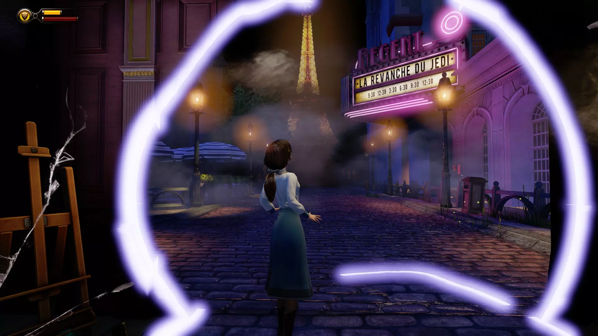 当伊丽莎白打开一道通往一个看似与我们世界极为相似的现代巴黎的裂隙时,人们可以看到一家电影院正在为电影《绝地武士的复仇》做宣传。这是《绝地归来》在正式上映前使用过的片名。
