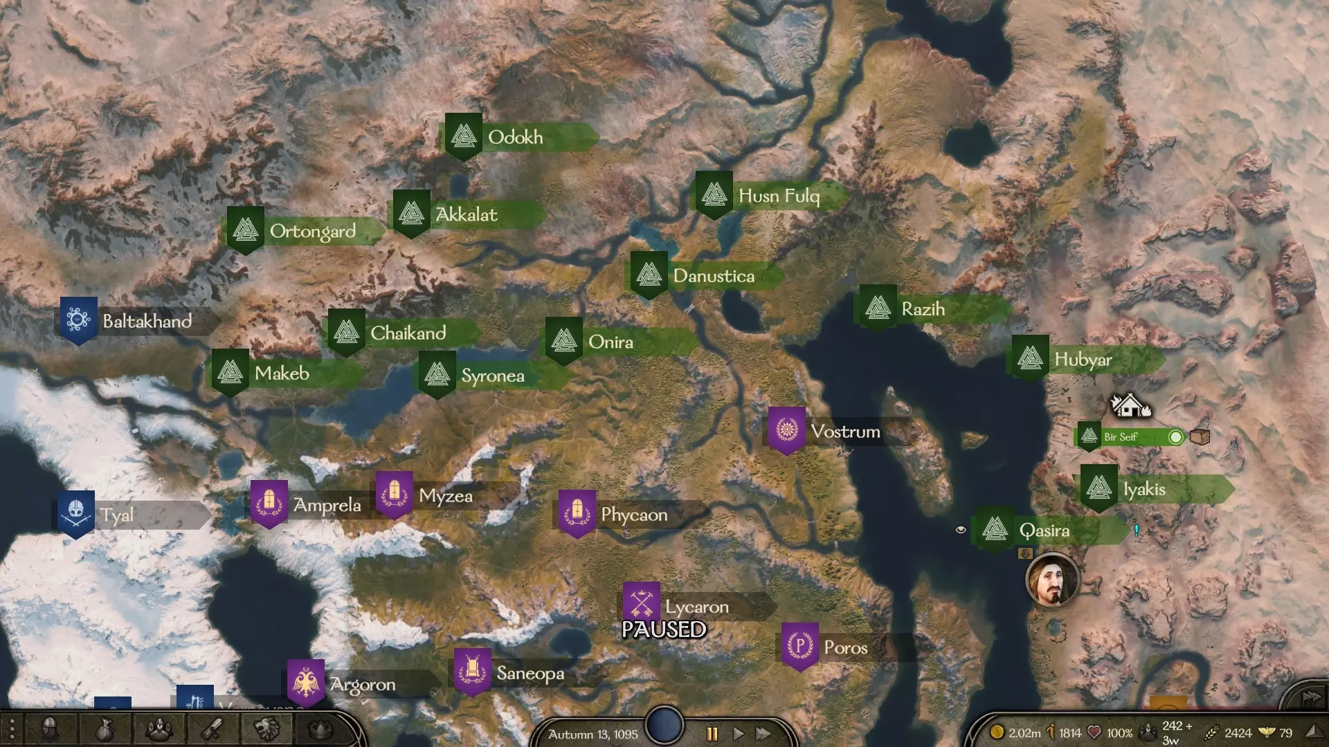如何开始征服 首先,你必须组建一支至少200人的精锐军队,尽可能只招募骑兵。 然后,你需要始终从地图的右上角(阿塞莱和库赛特之间)开始行动,主要目标是在建立王国之前摧毁库赛特和阿塞莱。如果你足够幸运,他们的某个城市可能会发生叛乱,你只需向那个叛乱势力宣战,而不是向整个派系宣战。(城镇每天会为你提供金币,而城堡则会消耗你的金币储备) 击败一个派系的简单方法是夺取一座城堡,并在那里留下少量驻军,这样可以吸引任何敌军。当敌军开始围攻城堡时,他们会被困在围攻中,无法撤退。只处决氏族领袖,这样他们的氏族就会解散,并将贵族们关入地牢。 记得检查地牢,有时在击败敌军后,敌方贵族会被送往他们正在围攻的城堡或城镇。 将国王关押在监狱中,这样你就能尽可能多地占领城镇和城堡,直到你宣布建国。因为如果你没有王国,杀死国王可能会导致该派系覆灭,而邻近的王国会趁机夺走所有城堡和城镇。 在你宣布建国之前,没有派系会向你宣战。