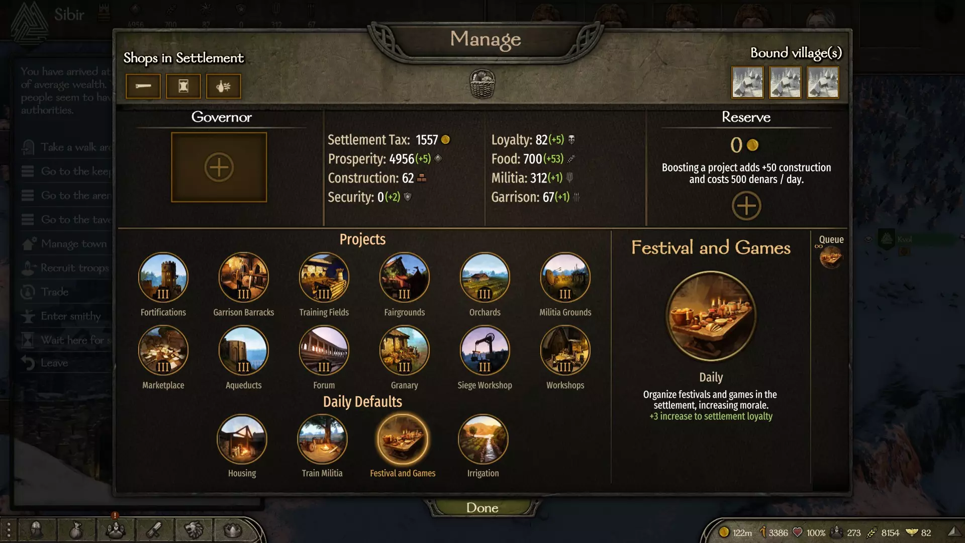 维持城镇与城堡的秩序 当你占领一座城镇或城堡时,务必选择【展现仁慈】以避免激怒民众。 由于你尚未建立王国,无法制定政策,因此必须始终点击【管理城堡】,清除AI在该城镇中选择建造的建筑,并将【庆典与游戏】设为日常默认选项,以确保不会发生叛乱。总督为可选设置,他们是你的同伴,你随时可以按L键将他们召回队伍。