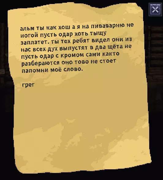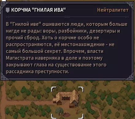 重要提示:在酒馆里可以和酒馆老板交谈,他会讲述关于农场、他的工人们兄弟、母亲以及他患有精神疾病的年迈父亲的事情,他的父亲夜里会去寻找已故国王的宝藏。我夜里在酒馆附近没有找到他,可能之后会添加隐藏任务。 “烂柳树”酒馆(曼希尔东北部,在路上可以遇到)。