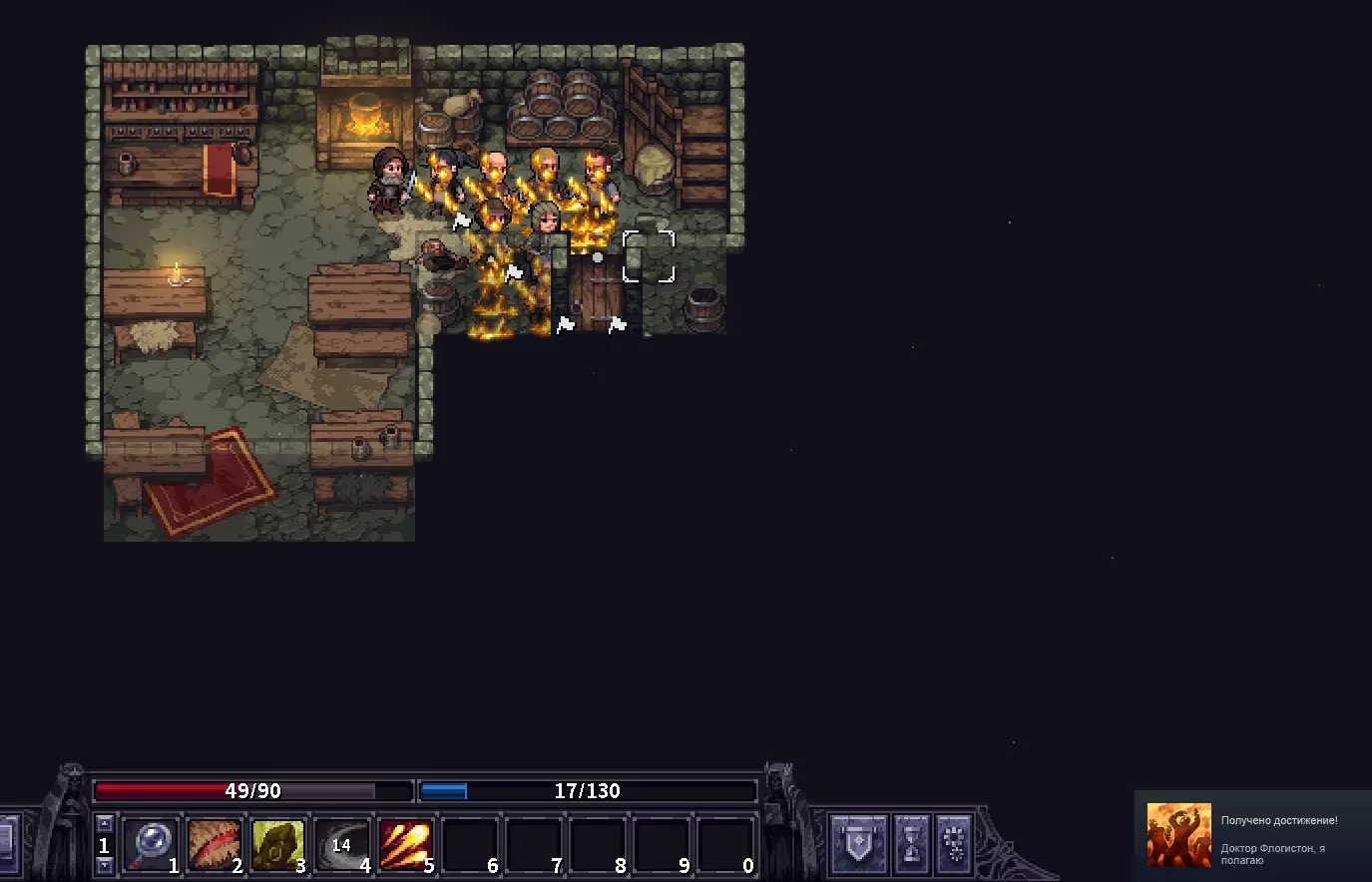 一定要把符文石碑紧靠着酒馆的门放(这样就没人能跑掉了),然后激怒所有顾客(随便怎么激怒,只要能及时站到正确的格子上就行)。把人群聚集在自己周围的格子上。如果有人卡住了,就用石碑推他们。(危险的NPC只有维伦,但他会在人群后面,主要对顾客释放火球术,所以不用怕他)当周围聚集6人及以上时,使用“火焰之环”,等待1回合,所有人就都会被点燃。成就也会到手。