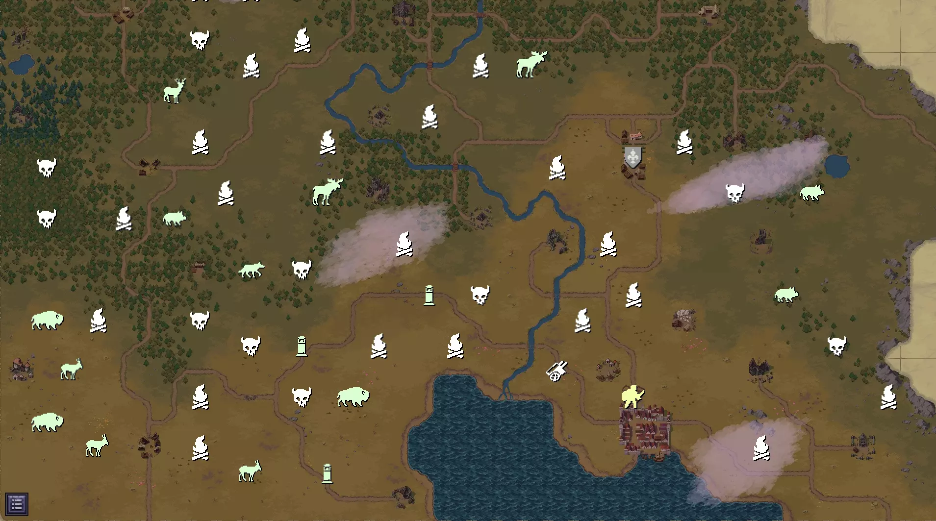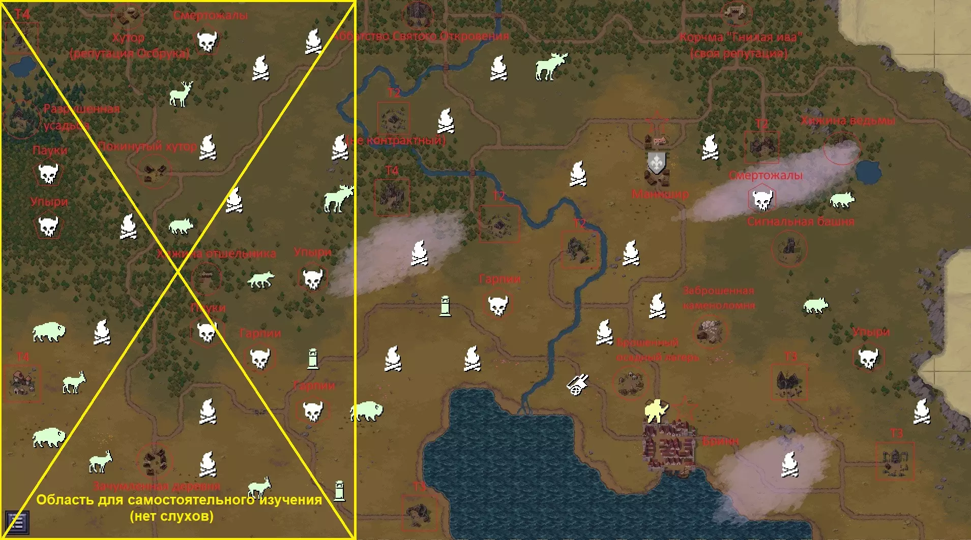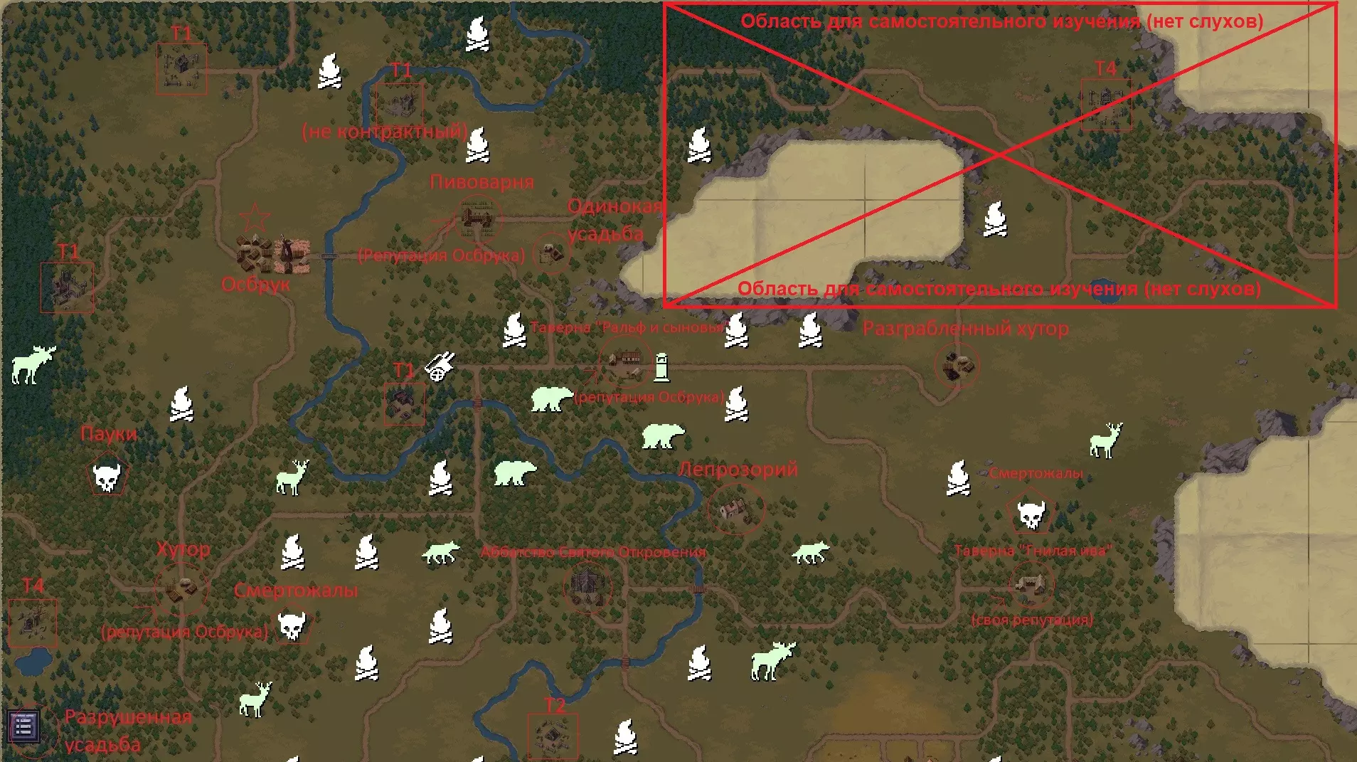 图例: 【多边形中的颅骨】- 怪物巢穴; 【正方形】- 地牢; 【圆形】- 过渡区域; 【星形】- 阵营定居点; 【动物符号】- 狩猎场; 【营火】- 土匪营地(带床); 【塔楼符号】- 路边祭坛。带对角线的矩形区域适合自行探索(传闻不会指向那里,该区域经常会出现T4地下城以及约2个旧地点/3个新地点) 未探索的区域中值得注意的是道路(可能会遇到载有战利品的马车/祭坛/强力伏兵。我没有探索是因为这简直糟透了。有非常多的土匪,虽然高等级时可以轻松应对他们,但装备在治安官那里贬值很快。尽量避免长时间的探索); 山脉(没有路,无法攀登,四处绕行。发现一个bug:山脚边缘区域的怪物会卡住,比如可以轻松射击到它们) 如何研究这一切?很简单:穿上最新的模组装备,传送后前往地图左上角的方块区域。站在两个方块的边界上,向下走到无冰区域。然后你跳到所有相邻的方块上,看看有什么东西,需要的话就研究一下。 一开始我想通过道路探索所有地方,但在布林内的T4地下城第6次通关时遇到的无尽匪徒,已经彻底打消了我在这款游戏中战斗的任何欲望。所以下面这个方法可以避免90%的冲突,只需根据你的位置跳到左侧或右侧的方块,这样怪物就不会追你了,当然前提是它们离你不太远。 更新 06.12.21:随着0.7.0.16版本更新,战斗中逃离怪物的方法已失效,因为它们也会移动到下一个方块。目前只能巧妙利用障碍物来转移怪物的仇恨(它们会沿着之前追你的方向一直走到地图尽头),或者将仇恨转移到其他怪物身上,又或者在城里尝试借助卫兵的力量(前提是你身后没有5-6头野牛)。 我们拥有的资源:35个土匪营地(随机分布在整个地图上)。根据传闻,可能会标记为:废弃营地、强盗营地、驿站营地、林间空地营地等。所有名称中带有“营地”的标记均为土匪营地。还需注意,在新一代游戏中,部分土匪营地不会显示在地图格子上。这可能是漏洞,也可能后续会更新添加。 3个熊穴(位置靠近地图中心)。新游戏开始时会随机生成!3条鹿径(随机出现在远离聚落的针叶林/阔叶林/田野) 3条野猪径(主要出现在远离聚落的阔叶林) 3条驼鹿径(随机出现在远离聚落的针叶林/阔叶林) 3条狼径(随机出现在远离聚落的针叶林/阔叶林) 3片野牛牧场(随机出现在南方草原) 3片赛加羚羊牧场(随机出现在南方草原) 3个杀人蜂蜂巢 | 3个蜘蛛巢穴 | 3个吸血鬼巢穴 | 3鹰身女妖巢穴(随机生成于远离定居点的位置) 地点 奥兹布鲁克、曼恩希尔、布林纳附近分别有3个T1、T2、T3地下城(可通过契约在地图上标记) 奥兹布鲁克|曼恩希尔区域各有1个T1和1个T2地下城(试炼相关信息不准确) 4个T4地下城(1个位于中心,其余3个通常分布在地图边界附近(左侧?))