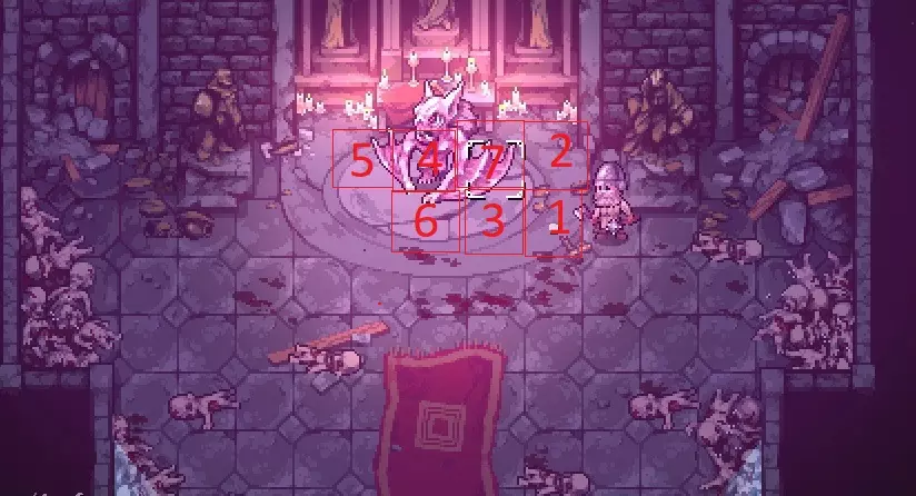 步骤:第二阶段已开始。前往1号格子,之后执政官会用小火球攻击我们。从火球处退到2号格子并跳过回合,随后执政官准备撞击主角。退到3号格子,执政官撞墙并陷入约2回合的僵直状态。持续攻击,之后按计划撤退,或一直攻击直到被击退到1号格子。踩上4号格子,执政官准备释放幽灵火球。后退到5号格子,执政官攻击落空。跳过回合,执政官准备发动冲撞。移动到6号格子,攻击被夹击的执政官。然后移动到7号格子躲避喷火龙,之后重复所有步骤。执政官就是你的了……