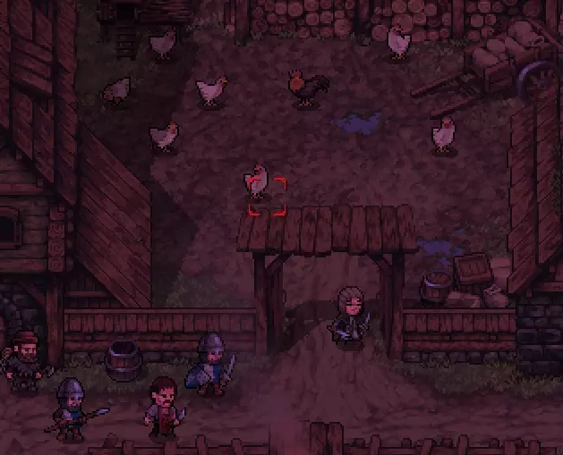 站在3号位置之间,等待其他NPC。这里的风险很高,因为卫兵在初期等级造成的伤害很大,如果你身边至少有1个卫兵,你的移动次数最多只有3次。所以这更适合运气好的玩家。(如果运气好,在NPC还没靠近你时,可以尝试用符文巨石移动小鸡,但它可能会流血并在战斗中倒下。)酒馆 我们都知道,工人们晚上喜欢放松一下,比如去小酒馆喝杯啤酒,看看足球比赛。在我们的情况下,情况非常相似:所有男性居民晚上都会去酒馆。那么,我们就在酒馆门口等待晚上的到来。我们必须看到所有的男人们一个接一个地进去。一旦天黑,并且已经聚集了相当多的人,我们也进去。站到屏幕下方的格子上。
