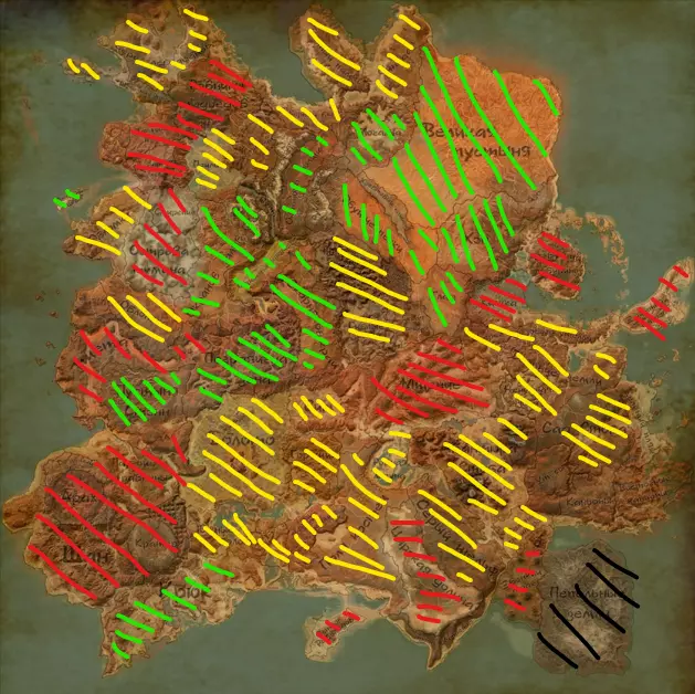 抱歉朋友,我不太会用Photoshop,但即便如此,我还是尝试按危险等级划分了区域。 绿色区域,是相对安全的区域。在这些区域里,危险不会24小时全天候潜伏着你,顶多会有一些土匪,或者是一些可以在城里找到掩护躲避的危险。 黄色区域,是对未准备充分的角色来说比较危险的区域。在进入这些区域之前,建议先提升一下自身实力。因为就算第一次侥幸没碰到敌人,第二次可能就没那么幸运了。 红色区域,如果你毫无准备就进入,或者主动招惹麻烦,很可能会在那里被消灭。 黑色区域,是游戏后期的地图,那里有大量危险的敌人,它们喜欢成群结队地行动。既然我们还没偏离主题太远,那就来聊聊那些如果你炫耀自己的角色就可能轻易被杀死的区域吧。 首先是相对危险的区域,然后是最残酷的地方。 【黑色沙漠】