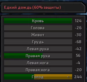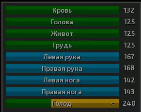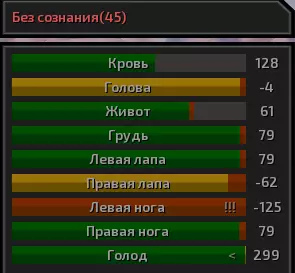 现在让我们来了解角色的生命值。 角色的身体有多个不同部位可能会受到伤害。不过,若腹部、胸部或头部的生命值降至-100(颈部为-125,躯干为-80),角色就会死亡。要是手部或腿部的生命值低于这些数值,下一次攻击就会将其打断。当角色的血液(或骷髅的机油)降至零以下时,角色会陷入昏迷。此外,如果肢体严重受损,角色可能会失去使用该肢体的能力,例如当手臂(的状态值)降至零以下时。