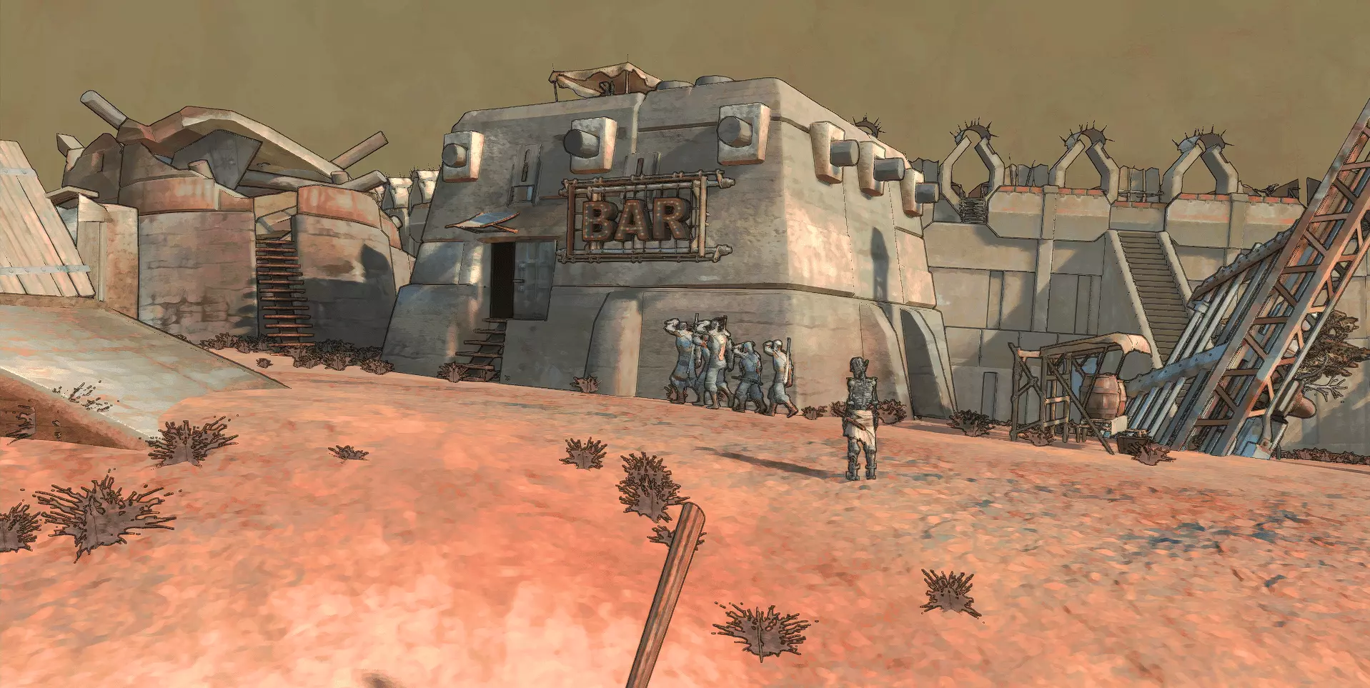 这个区域的特点是白天会有巨大的激光柱从天而降,几乎能烧毁路径上的一切。如果骷髅被这种光束击中,就会受到伤害。我之前提到过,它们对任何天气效果都免疫。对了,还记得“无人”开局吗?如果你选择这个开局,就会在这里生成五个角色。这其中的梗是什么呢?梗就在于在这里可以直接以5个骷髅的阵容开始游戏。是不是很有意思?【骸骨族】本身是稀有种族,整个游戏中能招募到的数量不多,所以这是给你的解决办法。如果你想在这里像个人类一样走动,那就买个【滤尘器】。向谁买?你懂的。【复仇】会通过流血对人体躯干造成伤害,如果角色没有失去手臂,可以用绷带和轮胎进行包扎。 【枯萎之地】和【钢铁山谷】