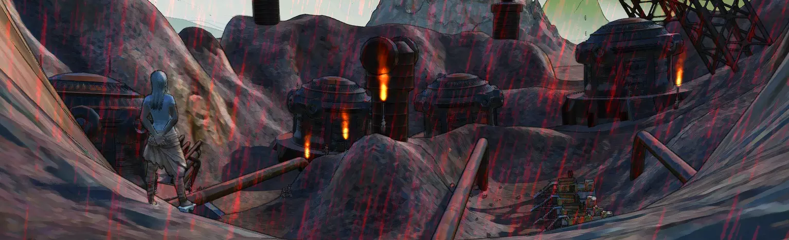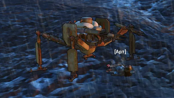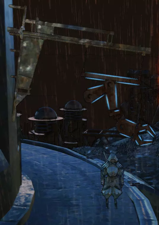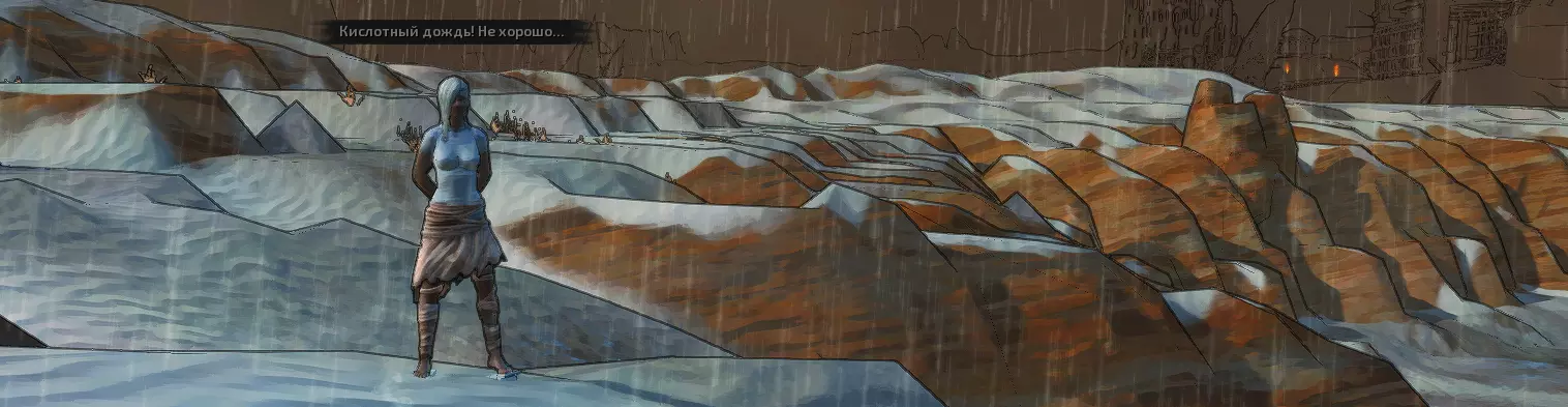 这两个区域全天24小时下着酸雨,所有水体都是酸性湖泊。进入这些区域本身就不会有什么好结果,长时间待在这里对人来说是致命的。除此之外,我想你也注意到了,这里有很多机械蜘蛛,大部分都无法运作,但也有一些还在工作。我曾经遇到过一只这样的蜘蛛,当时我的生命值已经见底,屏幕一片漆黑,而那只蜘蛛就悬停在我上方,迟迟不肯离开。