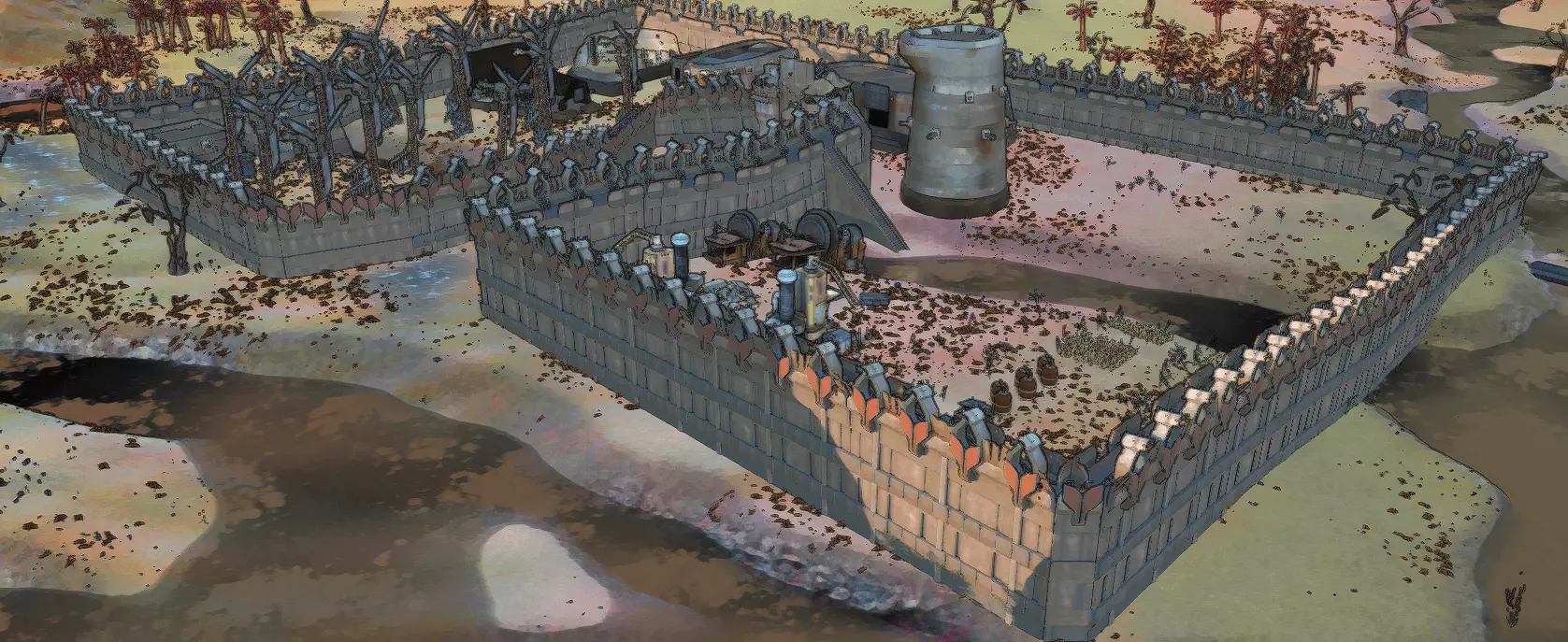 这是一个极其美丽但同时又异常危险的地方。和黑沙漠一样,这里也有毒气云,此外还有成群的无头骷髅和机器蜘蛛游荡。截图中你能看到两个灰烬穹顶,近处的那个聚集着一群无头骷髅,大约有50个甚至更多,它们都穿着盔甲,属性也很出色;远处则是疯狂的卡特隆,它几乎是游戏的最终Boss。强化改造(机械义肢、假肢)