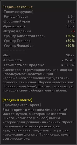 弯刀 - 一种特殊的武器,可称为中型武器,对敏捷和力量的要求相当。这类武器大多对机器人有伤害加成,但重量较大。 重型武器 - 游戏中最庞大的武器。体积大且重量沉,主要依赖力量属性。部分此类武器重量可达70公斤。非常适合应对各种情况,但最常用于对抗大规模敌人。 粉碎系 - 主要取决于力量,是用于非致命制服敌人的重型武器。对高护甲目标极为有效。 长柄系 - 对敏捷和力量的要求相当,是优秀的远程武器。通常拥有不错的攻击加成,在游戏初期可能会有所帮助。现在让我们来看看武器的HTK,这样我就能解释在选择武器时应该注意哪些方面。我们要讨论的武器是《落日》,类型:重型,品质:名刀。 选择武器时首先要注意的当然是伤害类型。对付轻型和中型护甲,劈砍伤害更合适。对付重型护甲,则用钝击伤害。
