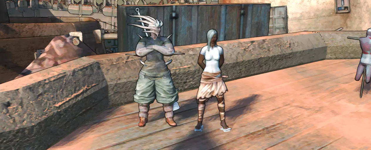 我们再次来谈谈势力。谢克族与圣国处于敌对状态,与联合城市保持中立。在谢克族的领土上,任何种族都可以安全生活,但有一个细节:如果你在他们的领土上建立定居点,他们会前来征收食物作为贡品。而如果你试图将毒品带入他们的城市,或者在接受检查时贿赂卫兵……最好不要这么做。谢克族的土地并非绝对安全。这里游荡着一些精选的卡拉尔和狂战士,他们对玩家态度相对中立,但相信我,他们总会找到攻击你的借口。此外,他们领地的常客还有土匪和蜘蛛。前者靠近东部区域,后者则在西南区域。你可以和酋长们结盟,条件是:把蛛王或圣主凤凰(无论死活)带给他们。统治这些酋长的是一位女性,她是最伟大的战士——埃萨塔·石魔(见上方截图)。如果与谢克派系结盟,埃萨塔会请求收她的女儿塞托为徒(右侧截图),塞托是一名独特的招募角色。如果你拥有前哨站,并且在与谢克结盟后遭到圣国成员的攻击,将会有一支非常强大的战士小队前来支援。总体而言,与谢克结盟既有利可图,也相当简单。击败甲虫之王相当容易,虽然它很强大,但一支10人的精锐小队就能轻松搞定(我甚至能用单个角色击败它)。如果与谢克斯结盟,你将自动成为圣国的敌人。此外,与谢克斯结盟还能免费招募部队来保卫你的城市或角色。圣国