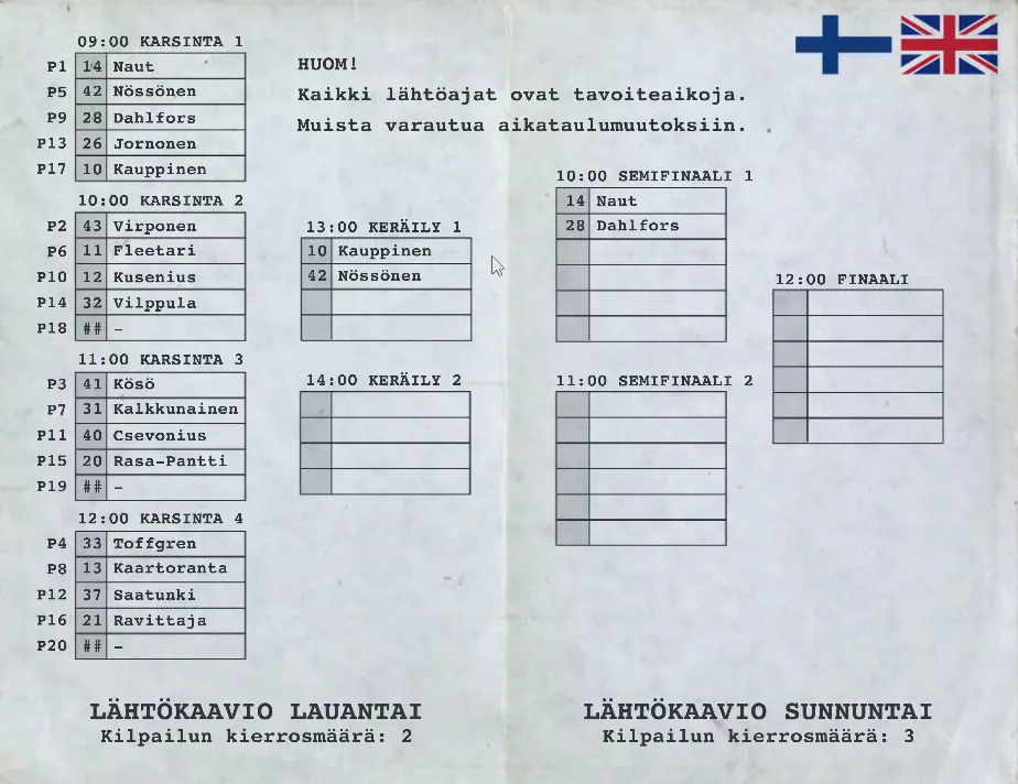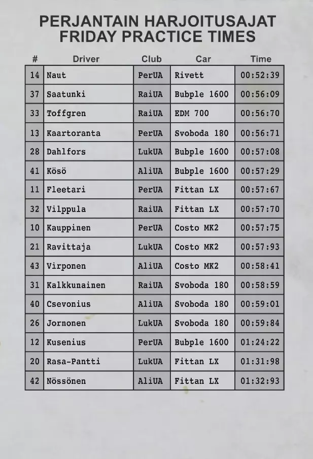 周日(决赛) 圈数:3 赛制:2场半决赛,前三名晋级总决赛。 流程:发车流程及规则与周六相同。 生存小贴士:帐篷 在等待其他组别比赛结束时,你可以前往赛道入口/停车区附近的小帐篷,那里有香肠和咖啡售卖。