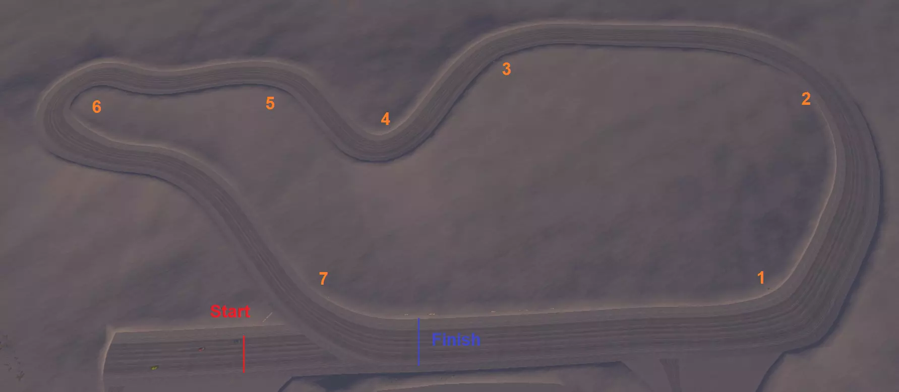 第一弯:简单。全油门。 第二弯:长弯道。需轻踩刹车。 第三弯:简单。全油门。 第四弯:急转弯。入弯前需重踩刹车。 第五弯:简单。全油门。 第六弯:180度急转弯。重踩刹车。 第七弯:简单。全油门直至终点。 终点:寻找小型【MAALI】标志。