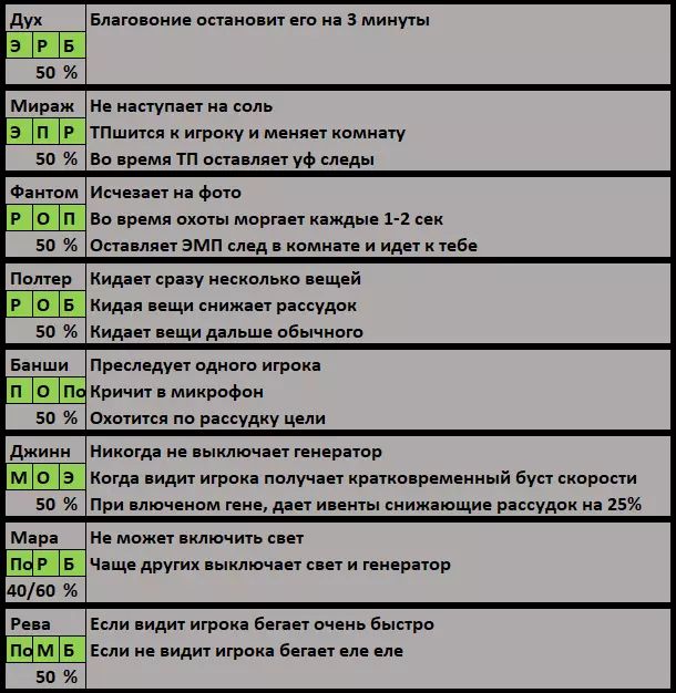 Дух Улики ЭМП 5 Радиоприемник Блокнот Краткое описание Стандарт призрака. Его активность средняя. Проверки Нужно зажечь рядом с призраком благовоние и засечь время. Дух не будет нападать и есть кресты целых 3 минуты, остальные же призраки нападут через 1.5 минуты после благовония (кроме демона, он нападет через минуту). Зажигать благовоние можно как на атаке, так и после нее, главное что бы призрак был рядом и благовоние сработало на него. Отследить это можно по заданию "зажечь благовоние рядом с призраком" если такое у вас имеется. Если же задания нет то обкурите призрака благовонием во время ивента, или при взаимодействии с предметами/дверьми (ведь призрак взаимодействует с тем что находится рядом с ним). Так же если вы обкуриваете призрака вне охоты то не стойте на месте, зажгите благовоние и бегайте по месту обитания призрака что бы точно задеть его. Мираж Улики ЭМП 5 Проектор Радиоприемник Особенности Теперь Мираж не может наступить на соль вообще, если призрак наступил, значит это НЕ Мираж, можешь не проверять уф фонариком. Мираж иногда телепортируется к игроку и меняет комнату на ту в которой стоял игрок. Ивент при этом не появляется, но срабатывает эмп 2, иногда эмп 5 если эта улика не скрыта настройками сложности. Если ты просто гуляешь по дому и внезапно ЭМП в руках заверещал и показал 2 огонька, скорее всего это шалит Мираж. Так же когда ты запустишь музыкальную шкатулку призрак может появится рядом с тобой и начать охоту прямо в упор к тебе. Бойся. Проверки В каждом доме есть коридор, по которому призрак будет ходить чаще всего, или стол, вокруг которого вы хотите поводить призрака. Теперь можно высыпать всю соль в одном месте, в котором призрак точно пройдет. В нынешнем патче призрак пройдя по соли обязательно активирует ее, все кроме Миража. Просто заставьте его пройти по соли, вот и все. Фантом Улики Радиоприемник Отпечатки Проектор Особенности Если сфотографировать Фантома или записать его на видео, то визуально его моделька исчезнет, а на медиа-фрагменте не будет помех. Во время гост-ивента, или при прохождении по лазерному проектору моделька призрака исчезнет до конца события, помехи на оборудовании пропадут, а звук сердцебиения исчезнет, хотя призрак продолжит издавать звуки до конца ивента, либо пока вы не спугнете его своим приближением. Когда ты слышишь стук сердцебиения находясь рядом с призраком или смотря на него, не важно на охоте это происходит или во время гост ивента, твой рассудок падает быстрее, со скорость. 0.5% в секунду. Во время охоты его моделька появляется раз в 1-2 секунды, реже чем у других призраков. Проверки Если есть подозрение на Фантом, держи при себе фотик или камеру. На ивенте тебе нужно успеть его сфотографировать или снять. Моделька Фантома пропадет после вспышки, но звуки ивента продолжаться. Иногда ивент бывает очень короткий и заканчивается сразу после вспышки, не дай бабайке себя обмануть. Нужно сфоткать его в начале ивента, что бы звук продолжился. Это легко проверить на пентаграмме. Зажигаете пять свечей и сразу же фоткаете призрака. Моделька исчезнет, но охота начнется. Так же моделька Фантома очень редко появляется на охоте. Обычно призрак моргает 2-3 раза в секунду, и ты видишь его почти постоянно, но моделька Фантом моргает раз в 1-2 секунды. Собирай смелость в кулачек, бери с собой благовони