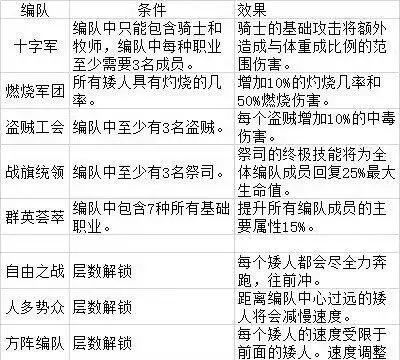 他的成长为耐力+932,学识+674,智力+327,敏捷+159。因此他可以携带圣骑士武器、术士武器、炮手武器。高级职业升级对应+2点属性,例如术士+1智力+1敏捷。死神和随军牧师纯废物,炮手专打boss,术士唯一真神。 游戏机制解析---特殊关卡: 前期,固定十轮刷新一波精英怪(兽人刺客),这波精英怪称为红关。 往后,随着关卡层数升高,新的红关精英怪---兽人死神和兽人术士也会在110关和120关登场。 往后便进入周期为20的循环---兽人刺客,兽人刺客+兽人死神,兽人刺客,兽人刺客+兽人术士。 红关打完可以进行免费神器三选一。 又有一种蓝色特效的精英怪,数值远高于常规兽人,击败后必掉落手中武器。常规关卡中有一种纯精英怪组成的关卡,可称为蓝关/3人组/6人组,其赏金极高,仅在溶洞背景下刷新。游戏机制解析——编队、锻造、仓库。正式版相比demo的最大不同是新增了三种玩法:编队、锻造、仓库。这三种新玩法需满足不同条件解锁:进行第一轮游戏并打到对应层数可解锁锻造与仓库功能,而编队则需达成特定编队条件才能解锁。以下为当前版本的五套编队组合。